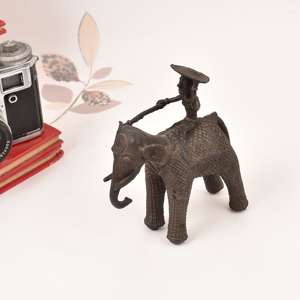 Behold the regal majesty of this stunning brass elephant statue, a captivating piece of Tribal Art that commands attention in any space. Crafted with meticulous detail, this vintage treasure features an elephant carrying a skilled rider atop its sturdy back, a testament to the enduring bond between man and beast. This brass elephant statue is more than just a decorative piece - it's a captivating work of art that tells a story of the ancient relationship between humans and the natural world. Imagine the majesty of the African savanna or the mystique of the Indian jungle as you display this stunning sculpture, allowing it to transport you to a world of timeless wonder and awe. Whether you're a collector of Tribal Art, a lover of all things elephants, or simply someone who appreciates the beauty of exceptional craftsmanship, this brass elephant statue is a must-have addition to your home. Elevate your space with this regal, conversation-starting piece and let it inspire a sense of adventure, cultural appreciation, and deep connection with the natural world.