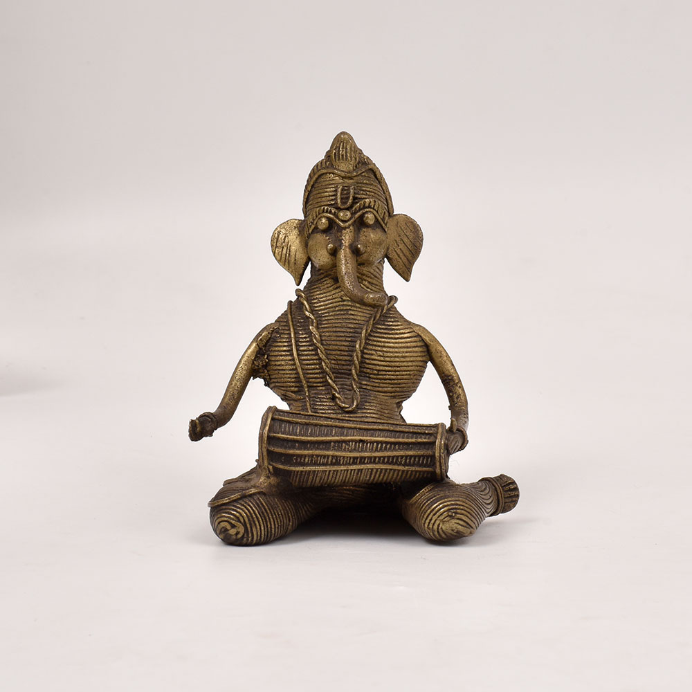 - Depicts the elephant-headed Lord Ganesha playing a traditional drum instrument