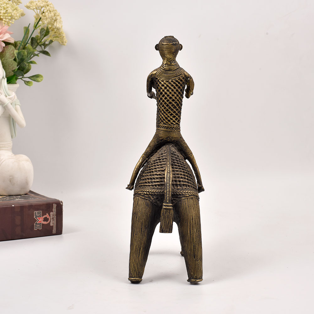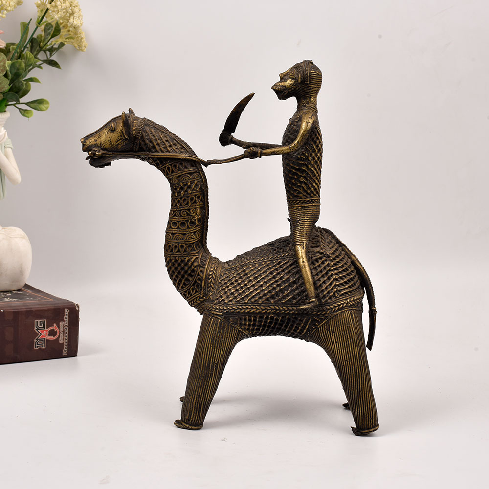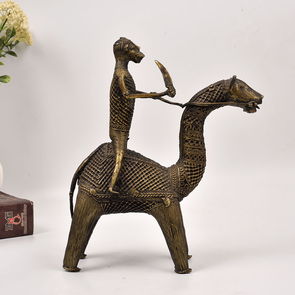 Prepare to be enchanted by the sheer magnificence of this exquisite brass statue, a stunning representation of Odisha's vibrant tribal art heritage. Crafted with meticulous attention to detail, this striking depiction of a camel and its tribal rider is a true work of art that will captivate and inspire all who behold it. This brass camel and rider statue is more than just a decorative accessory - it's a testament to the enduring artistry of Odisha's skilled craftspeople. Imagine the regal presence it will command on your entryway table, living room mantel, or office bookshelf, transporting you and your guests to the enchanting world of this captivating region. Whether you're a seasoned collector of tribal art or simply seeking to infuse your space with a touch of global sophistication, this Odisha camel rider statue is a must-have addition. Its timeless elegance and impeccable craftsmanship will elevate your décor while igniting your imagination and inspiring you to explore the rich cultural heritage that has given rise to such exquisite works of art. Embrace the spirit of adventure and make this stunning brass treasure a part of your home today.
