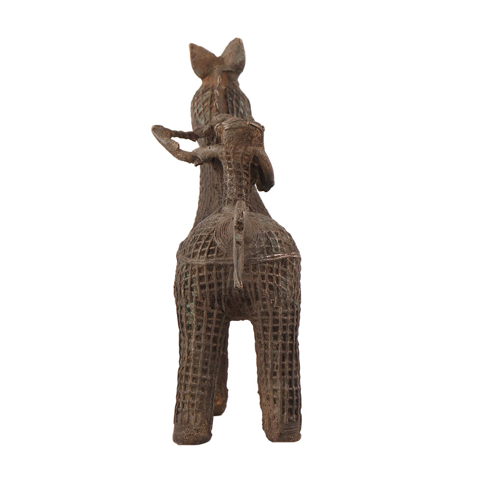 A brass horse statue that features two riders in a tribal art style, exuding a sense of dynamic energy and cultural flair. It is handmade by skilled artisans from India, the statue showcases intricate craftsmanship and attention to detail. With its stunning brass finish, this horse statue serves as a unique decorative piece, adding a touch of elegance and charm to any space. It can also be a cherished addition to a collection or a thoughtful gift for near and dear ones, symbolizing strength, vitality, and prosperity. This brass horse statue is a true masterpiece that embodies the artistic excellence and rich heritage of Indian craftsmanship.