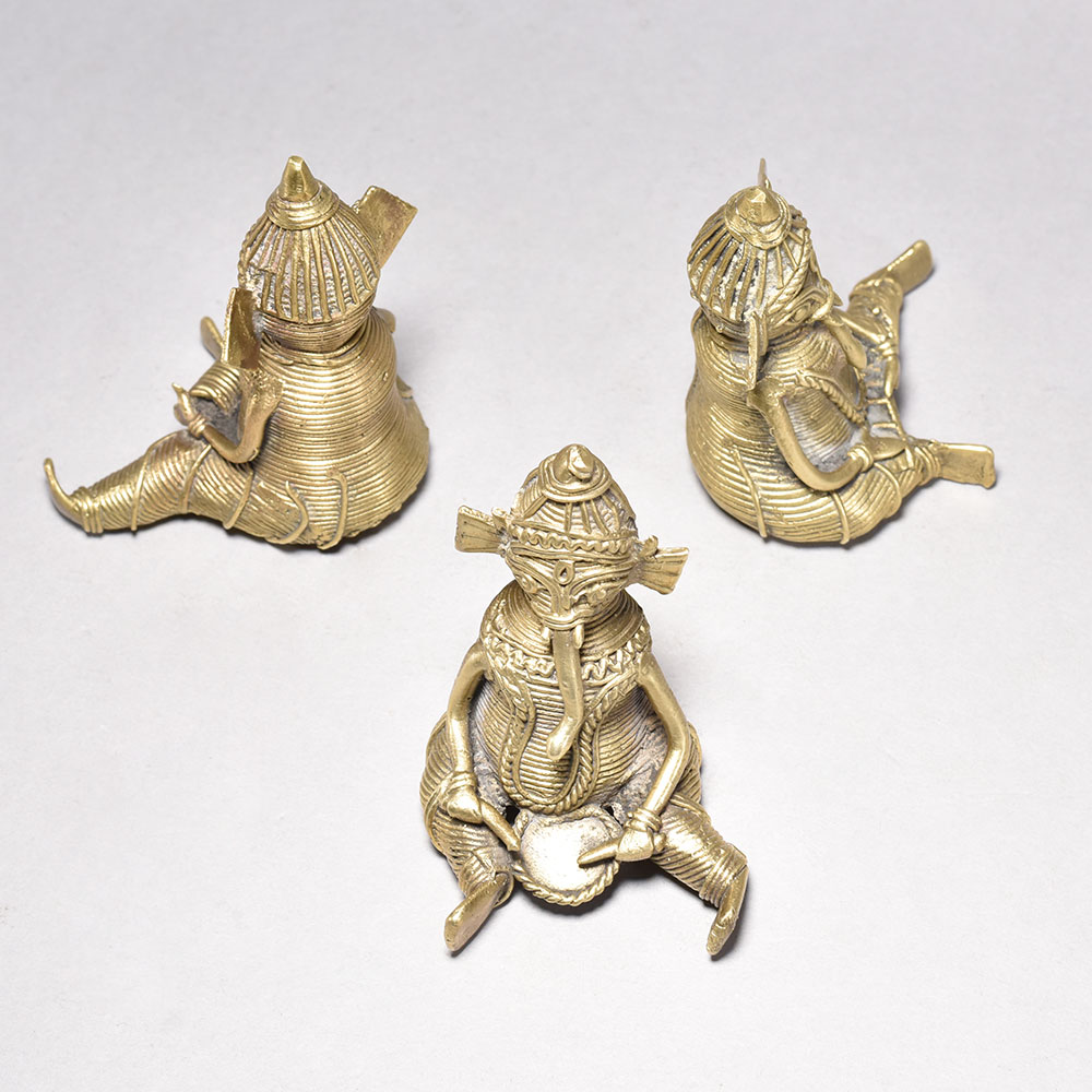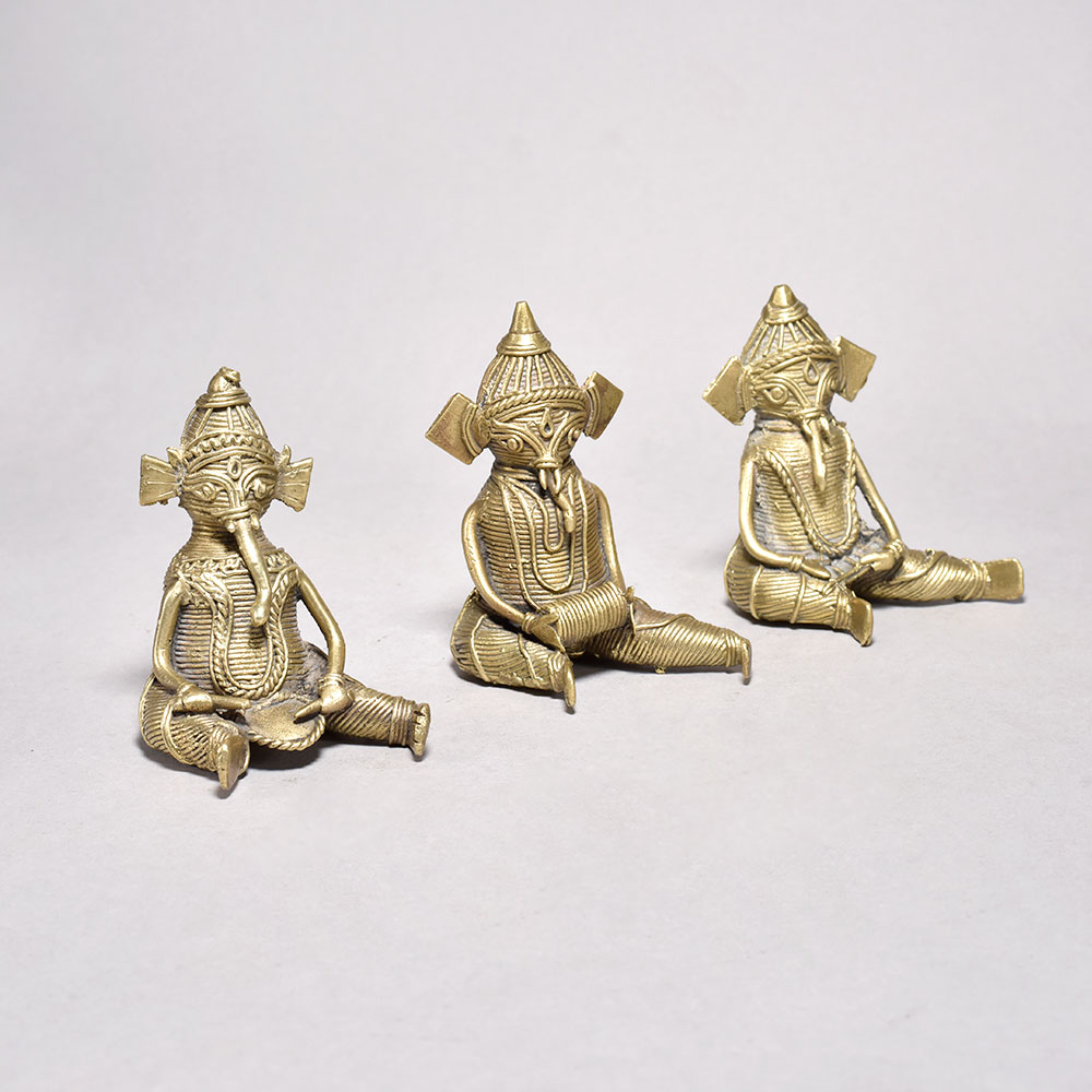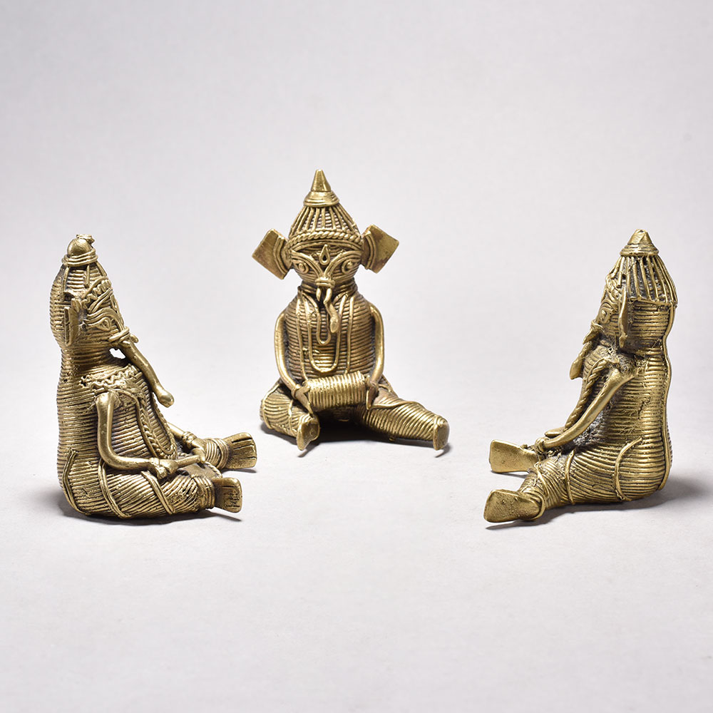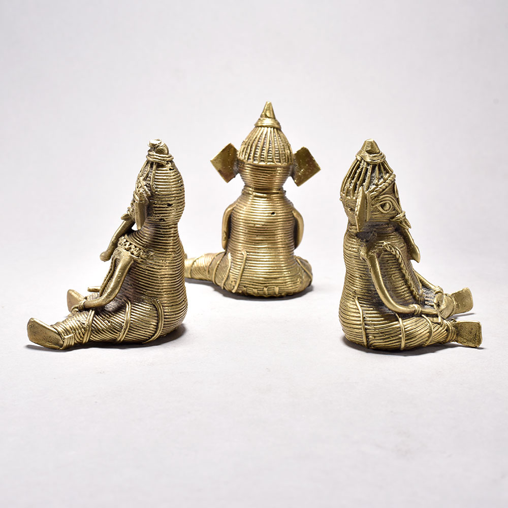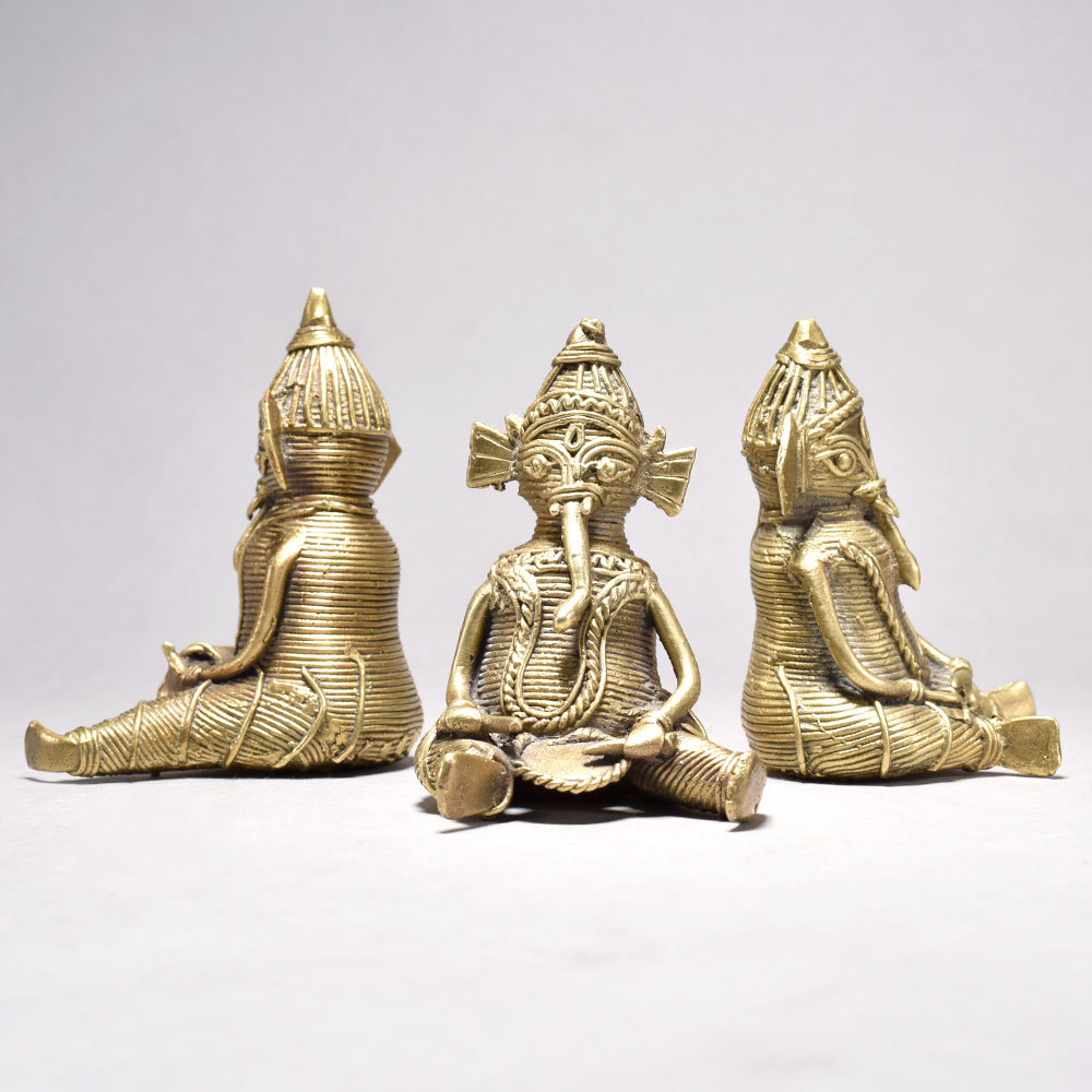 Elevate your home with the mesmerizing Tribal Art Lord Ganesha Set of 3.Bring the enchanting spirit of India into your space with this captivating trio of Lord Ganesha figurines. Crafted with exquisite attention to detail, each deity is uniquely depicted playing a different musical instrument, creating a harmonious symphony that will transport you to the heart of tribal culture. Display this breathtaking set as a stunning centerpiece or give it as a meaningful gift that celebrates the divine and the artistry of India's heritage. This Tribal Art Lord Ganesha Set is perfect for those who appreciate the beauty of traditional craftsmanship and seek to infuse their home with the sacred and the sublime. Let these three deities grace your space, filling it with the joyful melodies of India's timeless traditions. Meticulously handcrafted from fine Orissa metal This timeless piece is handcrafted by skilled artisans using time-honored techniques, ensuring each creation is truly one of a kind. Its versatile design makes it suitable for living rooms, bedrooms, offices, or meditation spaces, bringing a sense of heritage and style wherever it is displayed.