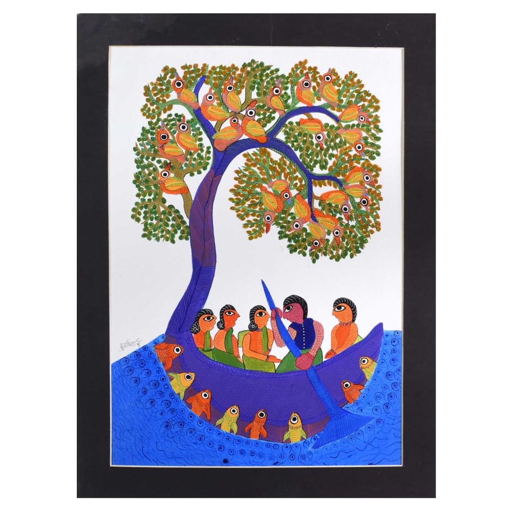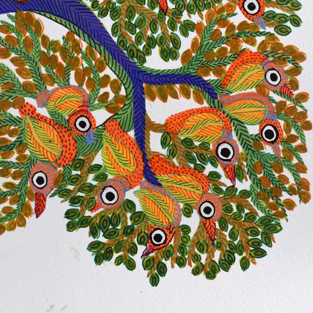 - Nature-centric symbolism: The work features symbolic depictions of birds and humans, representing the Gond people’s spiritual bond with nature.