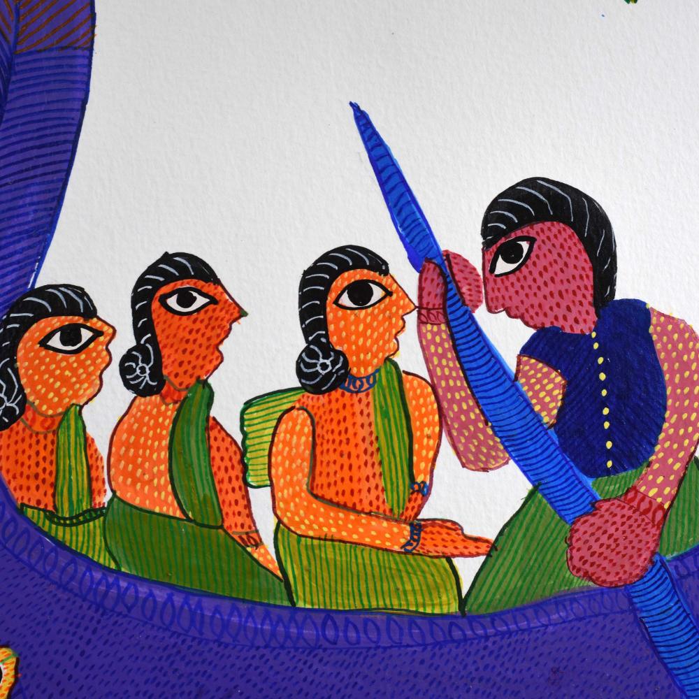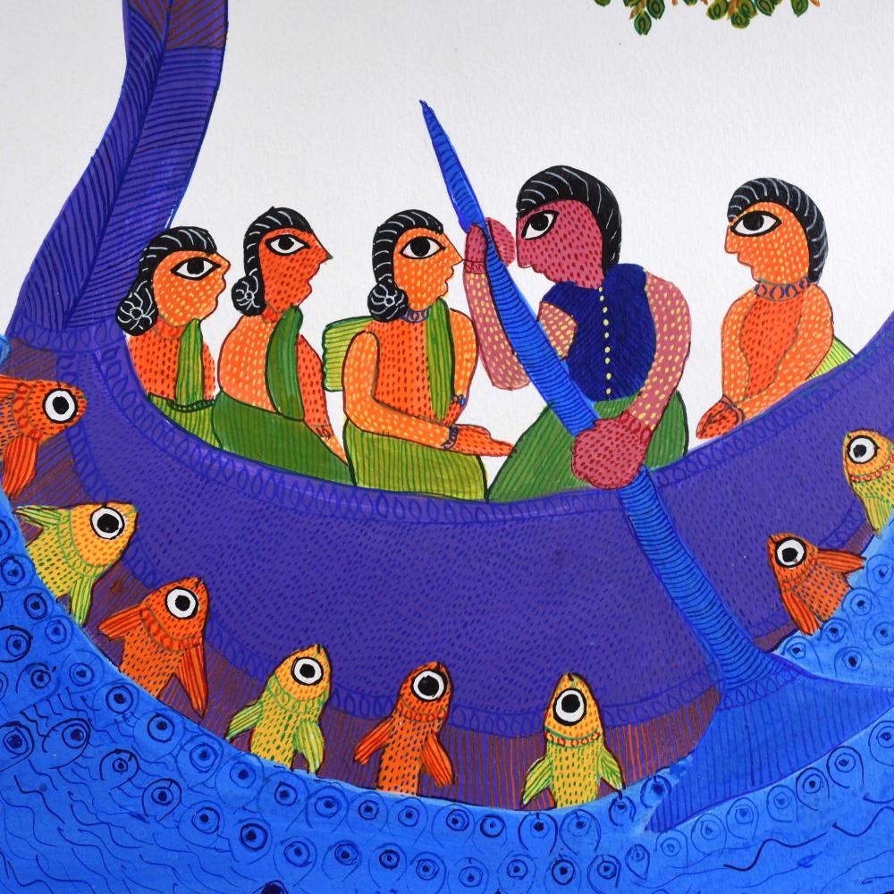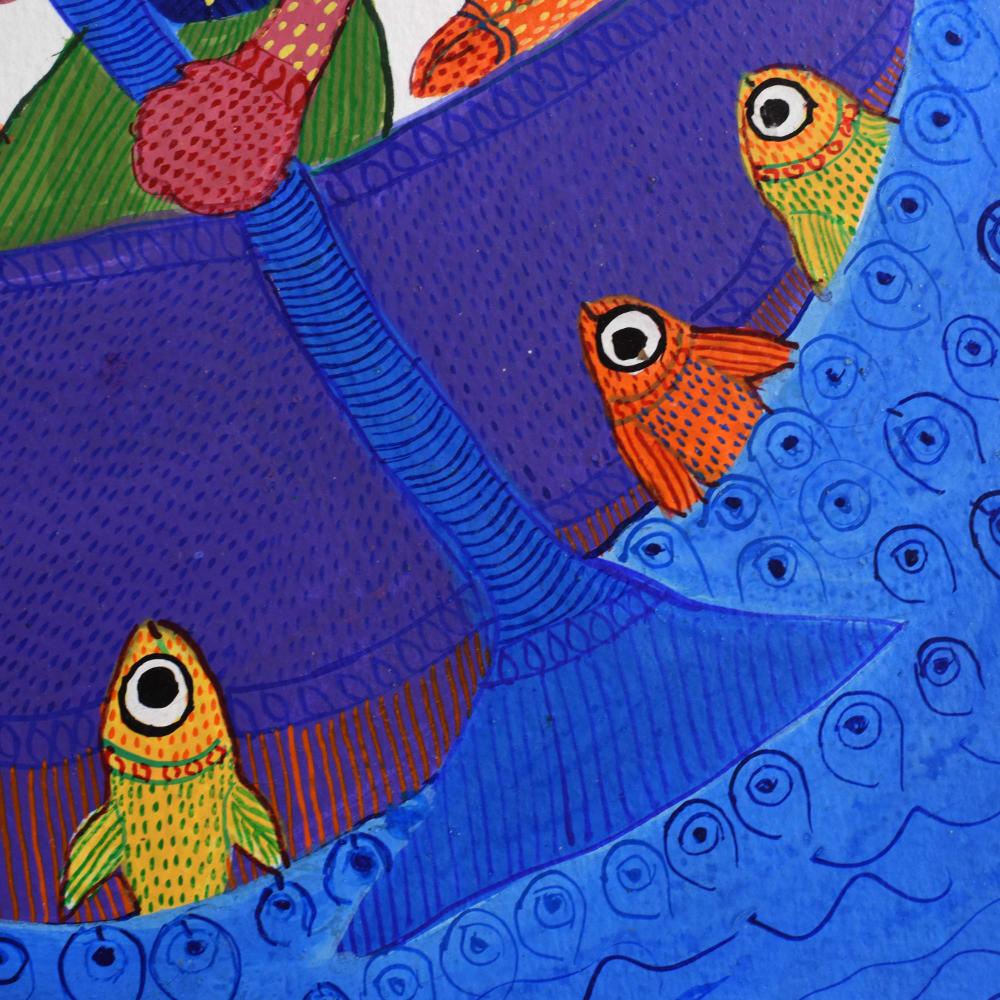Durgabai Vyam, a distinguished artist from the Gond tribe of Madhya Pradesh, has become an influential figure in the world of tribal art. In recognition of her extraordinary contributions to preserving and evolving Gond painting, she was awarded the Padma Shri in 2022. Durgabai’s work draws deeply from the rich folklore, mythology, and spiritual beliefs of the Gond people, and she uses her paintings as a medium to tell these ancient stories in a vibrant, contemporary way. This acrylic painting on paper exemplifies her artistic mastery. The piece features bright, bold colors such as blue, yellow, and green, capturing the energy and vitality of the natural world. The intricate use of dot work, lines, and geometric patterns adds texture and depth to the artwork, while also reflecting the interconnectedness of nature, animals, and spirituality—a central theme in Gond mythology. The painting brings to life the symbolism and the deep spiritual connection that the Gond people have with the environment, making it an evocative portrayal of the culture.