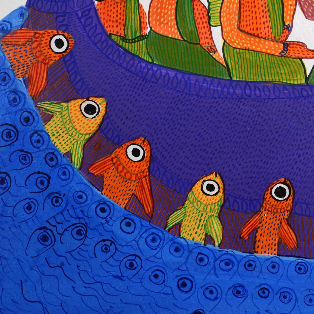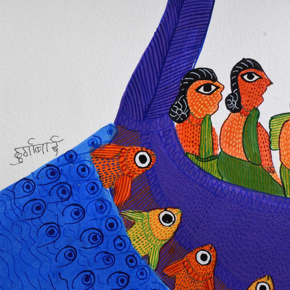 - Intricate dot work: Durgabai’s detailed dotting technique adds texture and complexity, characteristic of traditional Gond art.
