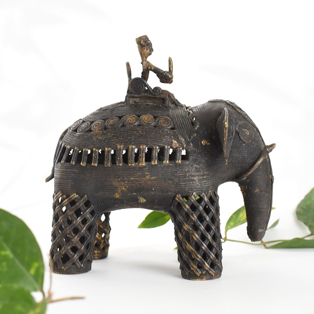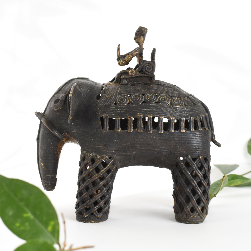 Celebrate the artistry of tribal metalwork with this elephant rider sculpture. Crafted using the ancient lost wax casting technique, the piece features an intricately detailed elephant with a rider sitting atop, carrying a sense of movement and storytelling. The lattice work on the elephant’s body and the expressive features of the rider reflect the skill and creativity of the artisan. Place this sculpture on a bookshelf, console, or mantel to add a touch of cultural heritage and conversation starting charm. The rustic finish adds depth and character, making it a striking standalone piece or part of a curated collection. Each sculpture is hand cast, ensuring that no two are exactly alike.