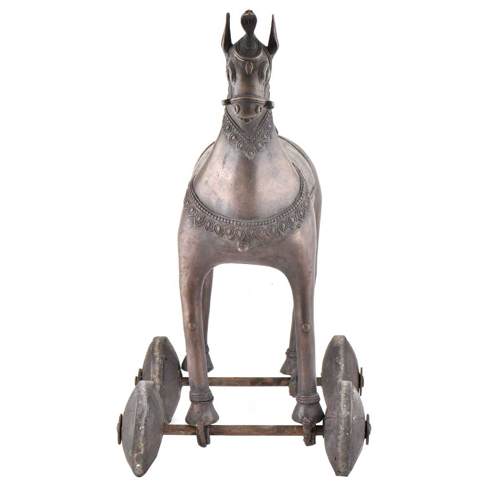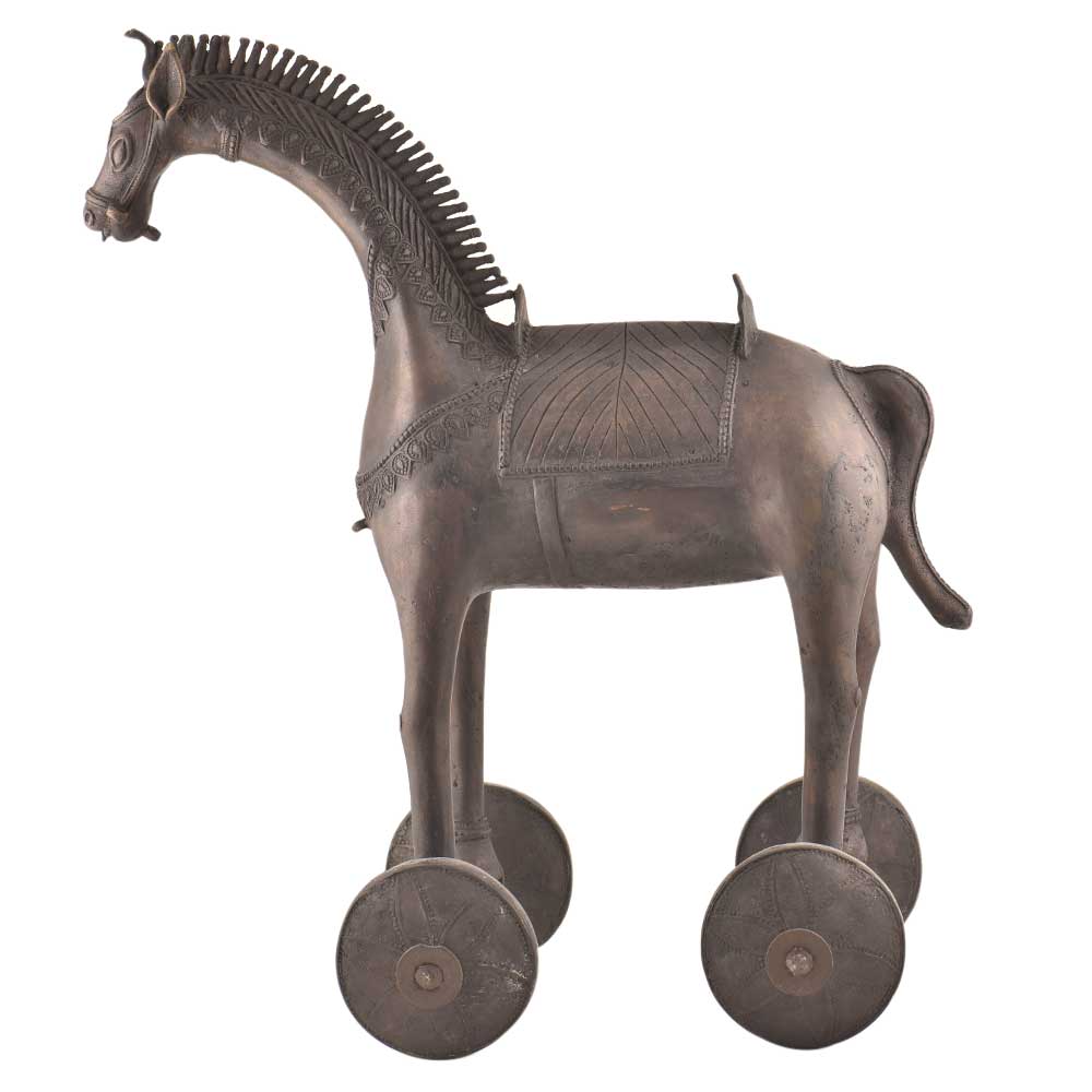 Brass Horse statue on rolling wheels made of pure brass by expert artisans who are masters of their trade. This statue is handmade and is an excellent home décor product. The wheels make it convenient to move it from one place to another. The children love to pay with it and it proves to be an excellent gifting option for friends and relatives.