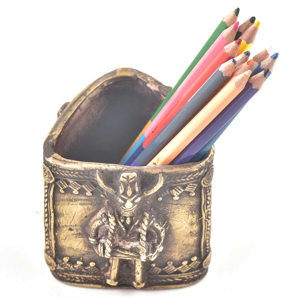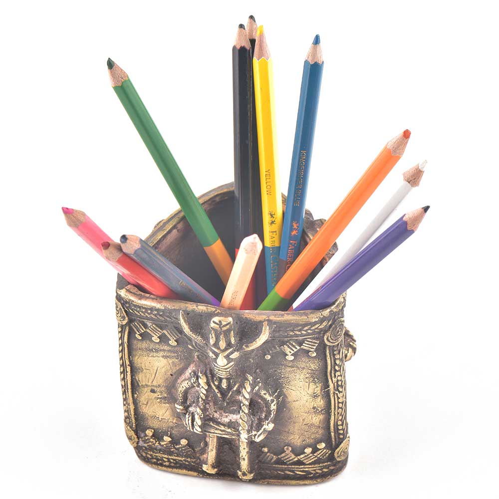 Hand made  tribal traditional metal craft made by the local tribals tribal figurine embossed on the metal stand add a very traditional and vintage look to your desk, office table or study table .An ideal gift to relatives and friends who are admirers of art.