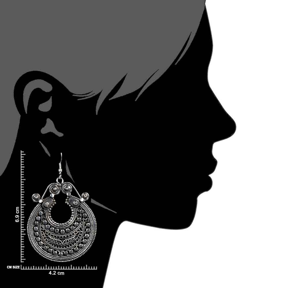 Tribal Hinged 92.5 Sterling silver earrings with filigree work round balls and traditional pattern in hand bali design. These dangle earrings can be paired with you suits, lehengas, saris and other traditional outfits. Gift it to your near and dear ones on diwali, birthday, valentine or on wedding day.