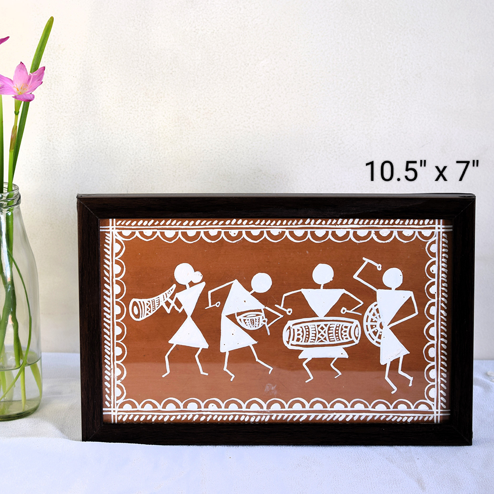 A lively Warli art painting depicting traditional tribal musicians playing various instruments, hand-drawn in white poster colours against a terracotta-toned background. The rhythmic figures, geometric styling, and decorative border embody the joy and cultural vibrance of rural festivities. Rooted in the indigenous art traditions of Maharashtra, this piece is a celebration of music, movement, and community spirit—perfect for ethnic décor lovers and folk art collectors.