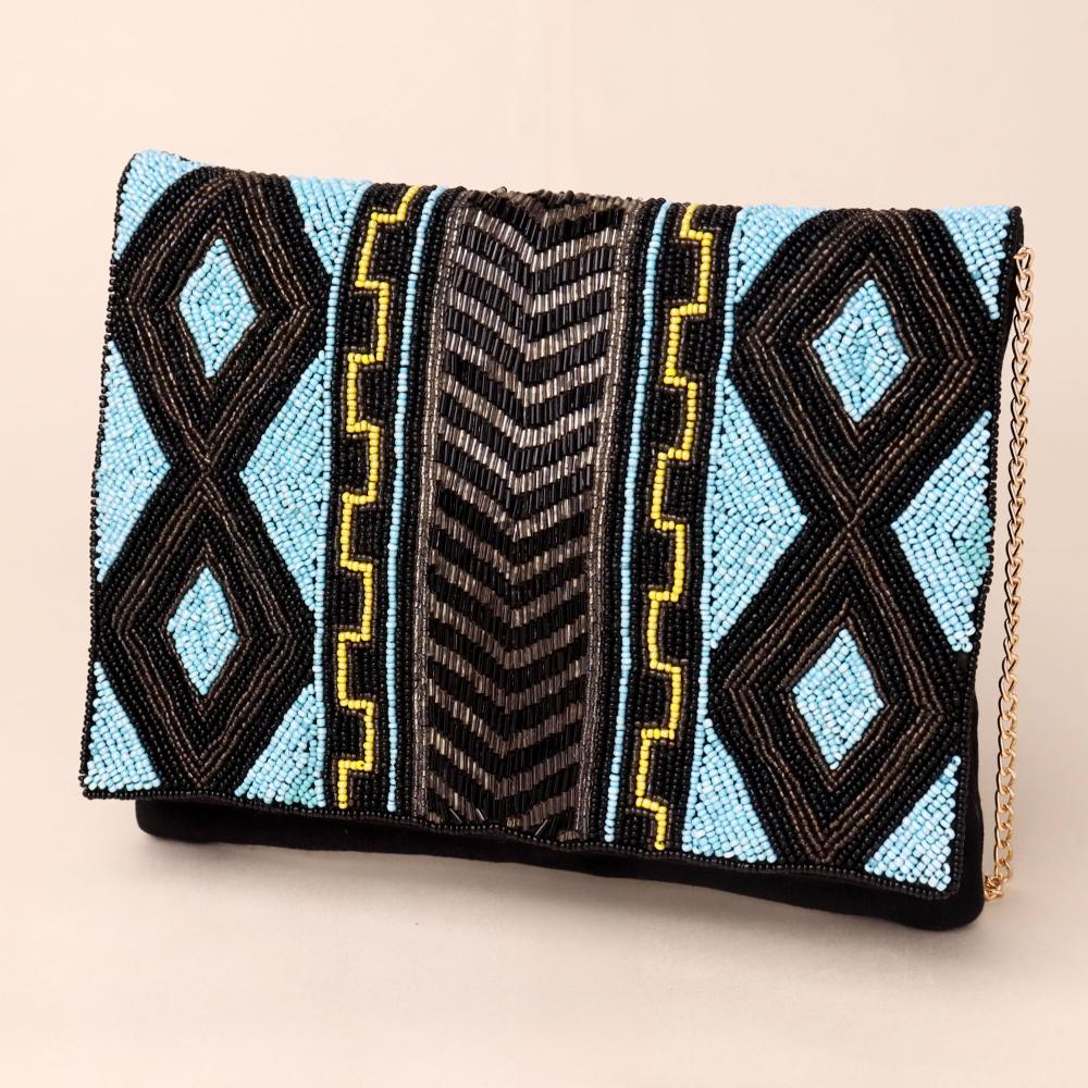 Celebrate bold artistry with this hand-beaded clutch inspired by tribal geometry and rhythmic patterns. Intricate beadwork in sharp contrasting tones lends it a striking personality, while the symmetrical design evokes a sense of grounded elegance. Paired with a sleek chain strap, this piece transitions effortlessly from day statements to evening glam.