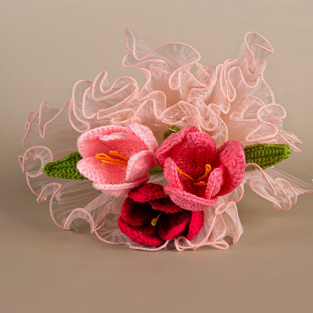 Keep your pink crochet piece away from moisture and direct sun to prevent dust and fading. Dust gently with a soft brush or a hairdryer on cool, and reshape stems carefully if needed.