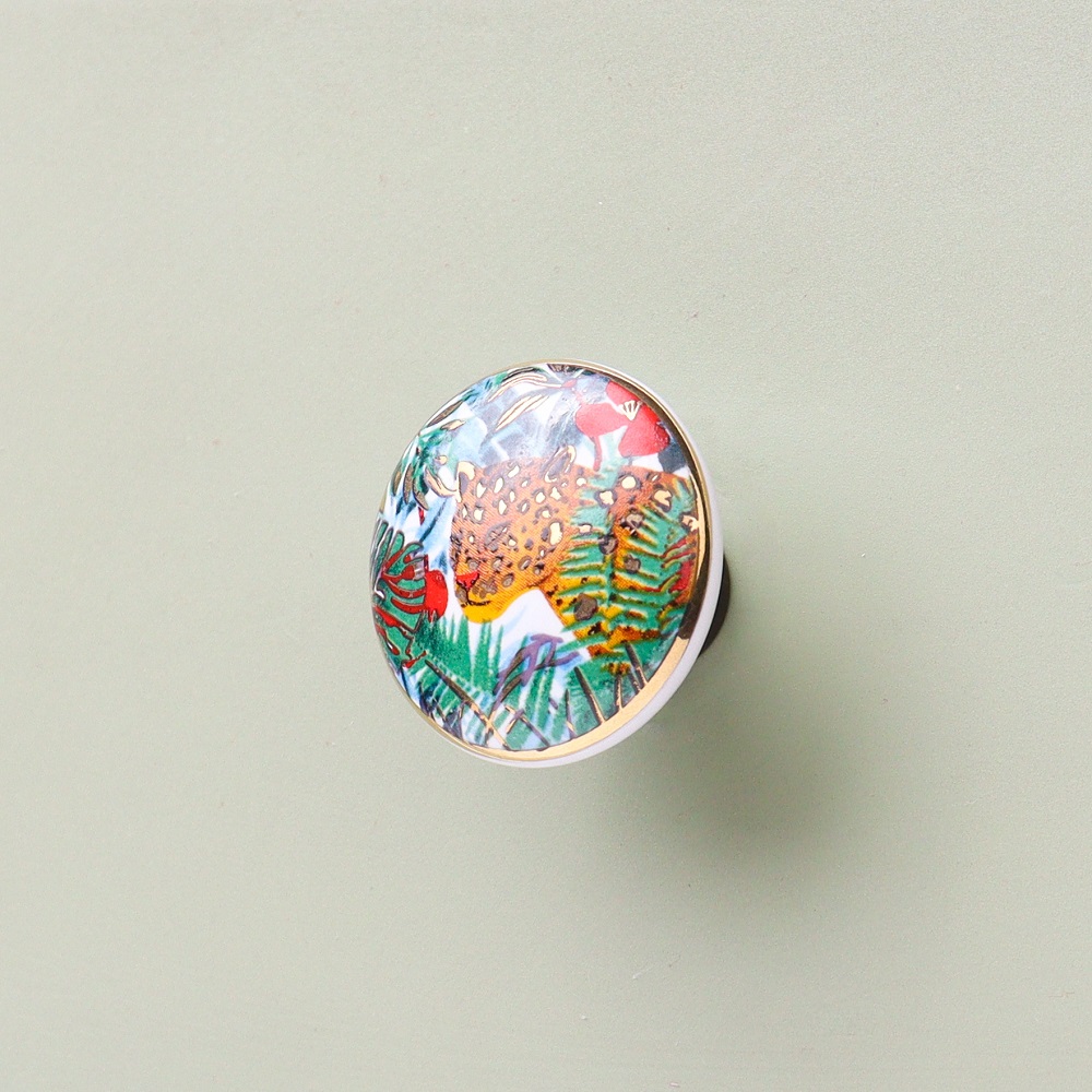 Add a touch of wild elegance to your home with the Tropical Theme Jaguar Ceramic Cabinet Knobs with Gold Work. Inspired by the lush beauty of the tropics, these eye-catching knobs feature a striking jaguar motif, with intricate gold detailing that enhances the design. The smooth ceramic surface is beautifully decorated, bringing the fierce yet graceful presence of the jaguar to life. Perfect for bringing a bit of nature's wonder into your interior decor, these knobs will stand out in any room, adding a bold and luxurious touch to your furniture.
