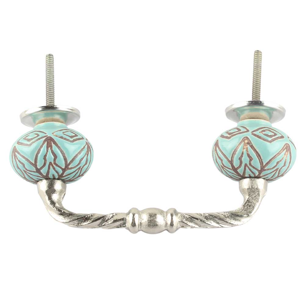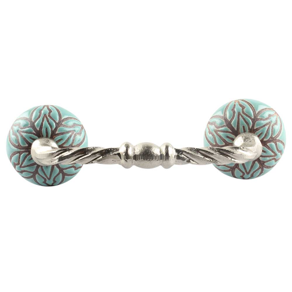 Turquoise Amarylis Floral Etched Ceramic Cut Bridge Handle. Ideal for Drawer, Dresser, Cabinet, Wardrobe, Cupboard and Almirah etc.