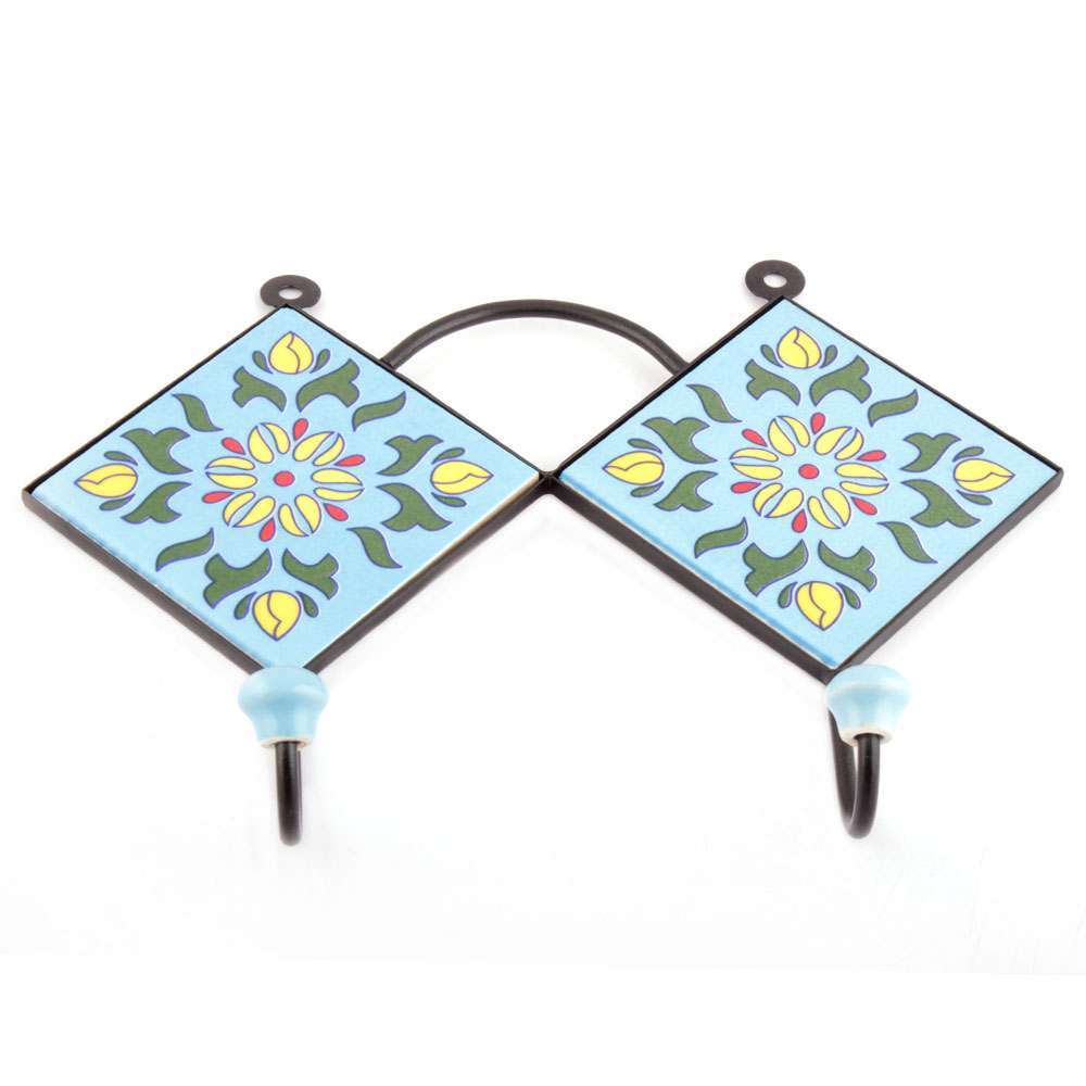 Turquoise And Forest Green Floral Tiles Hooks. When Put on Wall or Cabinet it is an Art in itself. The Metal Part of this Hook is Black Powder Coated.