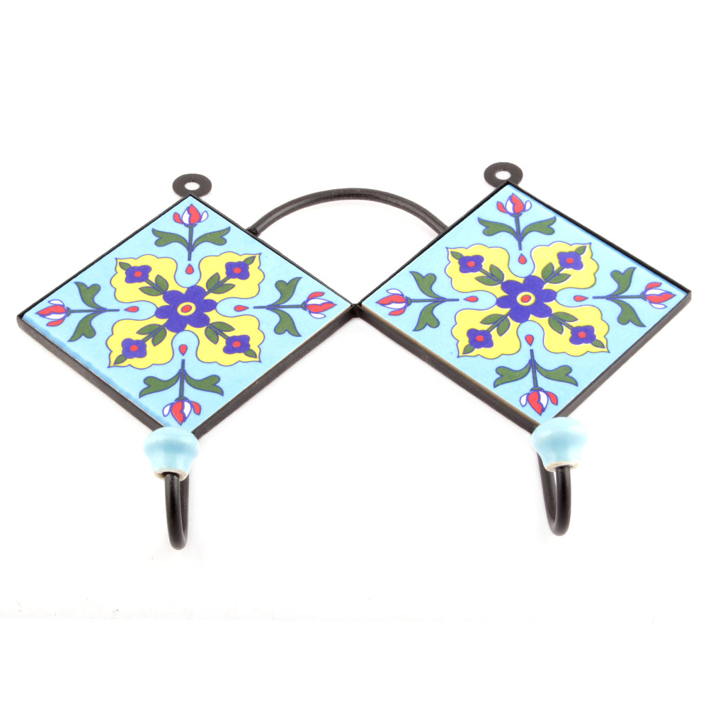 Turquoise And Navy Blue Tiny Flower Tiles Hooks. When Put on Wall or Cabinet it is an Art in itself. The Metal Part of this Hook is Black Powder Coated.