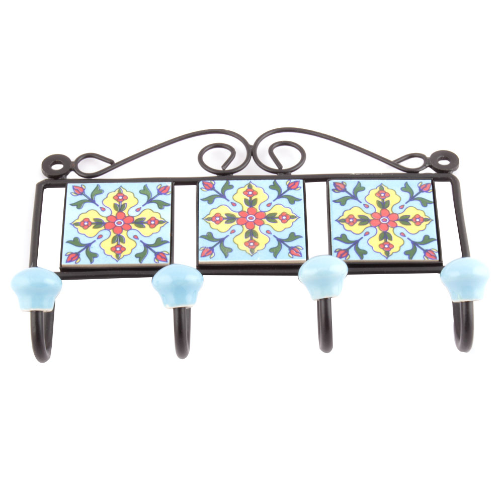 Turquoise And Red Tiny Flower Tiles Hooks. When Put on Wall or Cabinet it is an Art in itself. The Metal Part of this Hook is Black Powder Coated.
