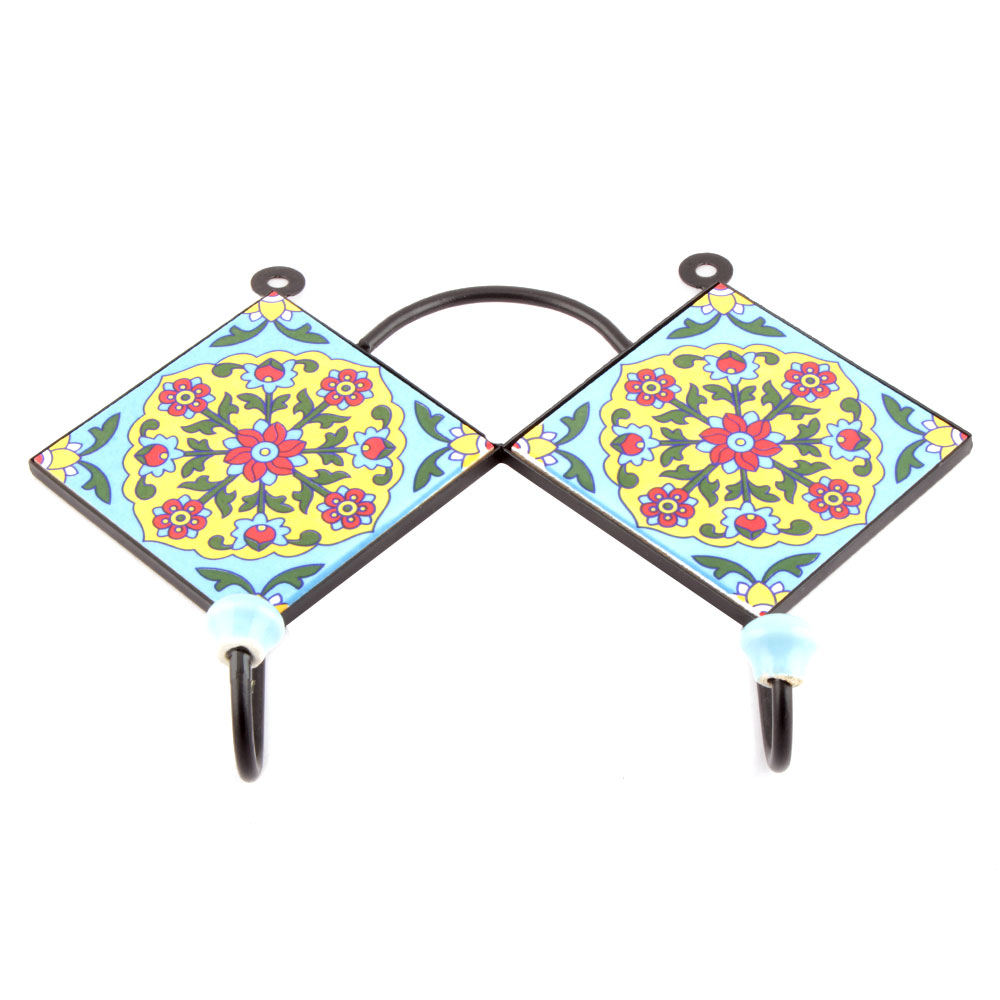 Turquoise And Red Tiny Flower Tiles Hooks. When Put on Wall or Cabinet it is an Art in itself. The Metal Part of this Hook is Black Powder Coated.
