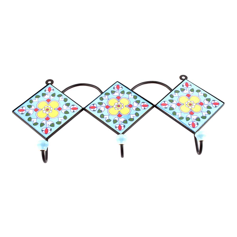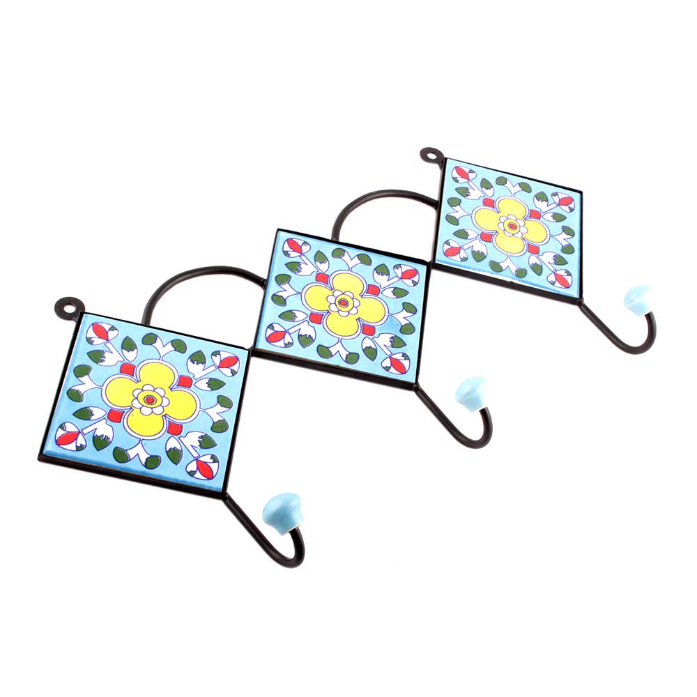 Turquoise And Yellow Ceramic Floral Tiles Hooks. When Put on Wall or Cabinet it is an Art in itself. The Metal Part of this Hook is Black Powder Coated.