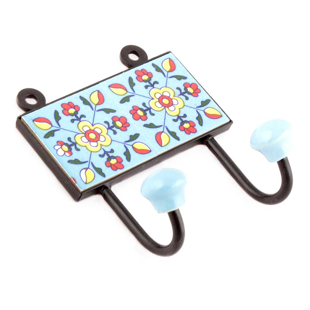 Turquoise And Yellow Floral Tiles Hooks Online. When Put on Wall or Cabinet it is an Art in itself. The Metal Part of this Hook is Black Powder Coated.