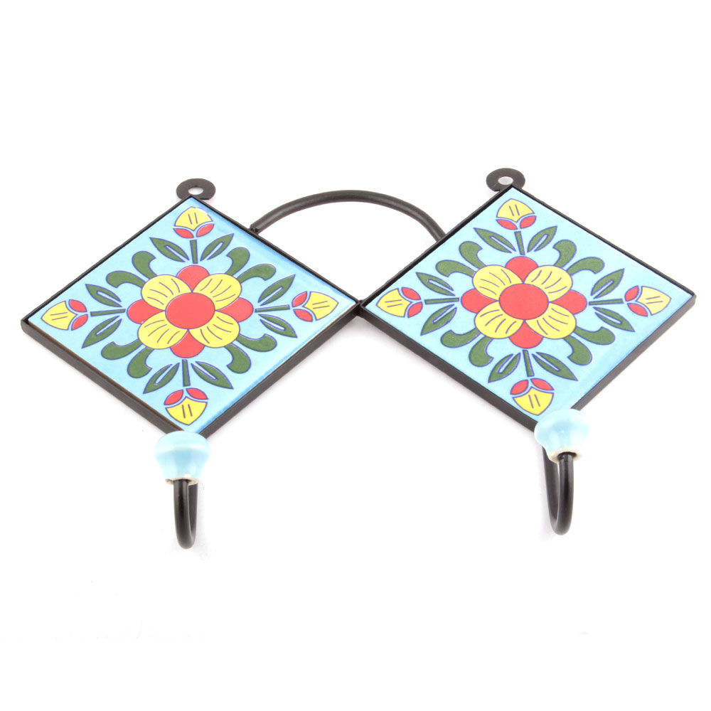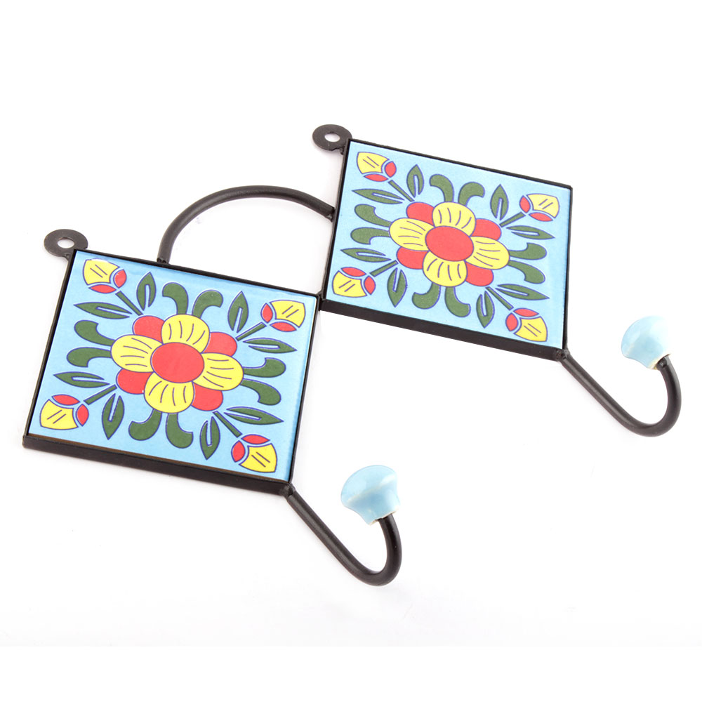 Turquoise And Yellow Floral Tiles Hooks. When Put on Wall or Cabinet it is an Art in itself. The Metal Part of this Hook is Black Powder Coated.