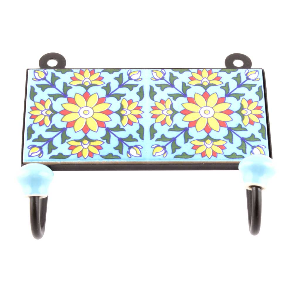 Turquoise And Yellow Sunflower Ceramic Tiles Hooks. When Put on Wall or Cabinet it is an Art in itself. The Metal Part of this Hook is Black Powder Coated.