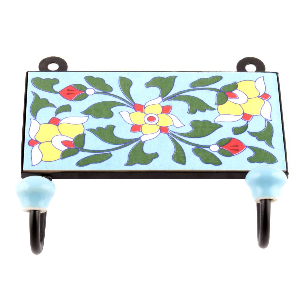 Turquoise And Yellow Tiny Flower Ceramic Tiles Hooks. When Put on Wall or Cabinet it is an Art in itself. The Metal Part of this Hook is Black Powder Coated.