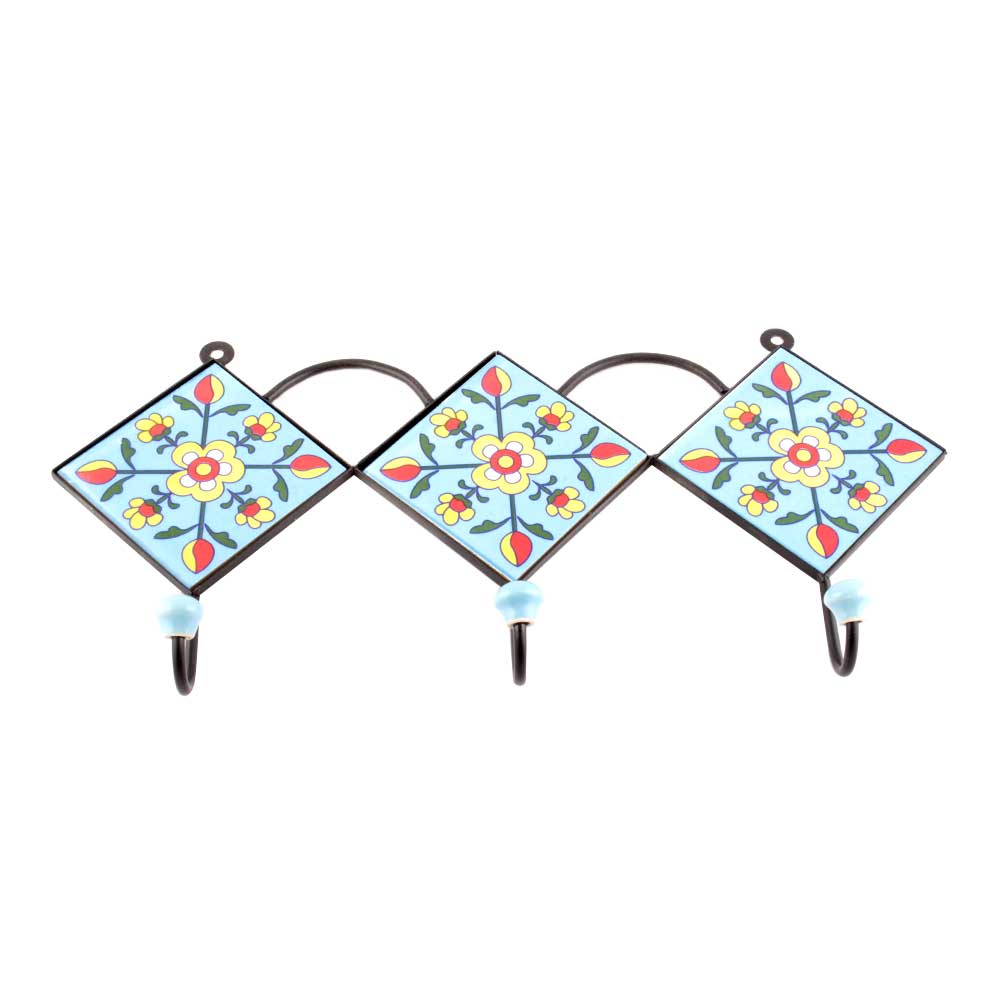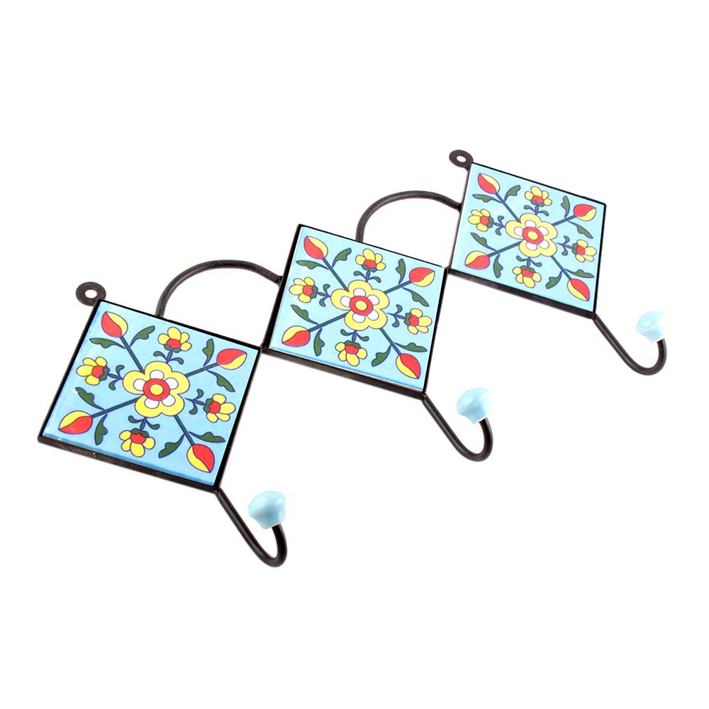 Turquoise And Yellow Tiny Flower Ceramic Tiles Hooks. When Put on Wall or Cabinet it is an Art in itself. The Metal Part of this Hook is Black Powder Coated.