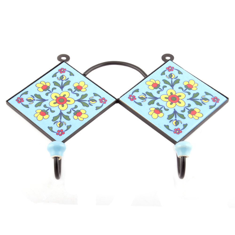 Turquoise And Yellow Tiny Flower Tiles Hooks. When Put on Wall or Cabinet it is an Art in itself. The Metal Part of this Hook is Black Powder Coated.
