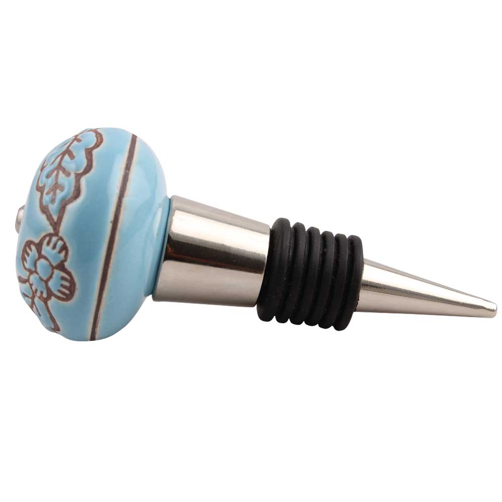 Turquoise Base Brown Leaf Flower Etched Ceramic Wine Stopper.zinc alloy wine bottle stopper with attractive Jute Bag Packaging.