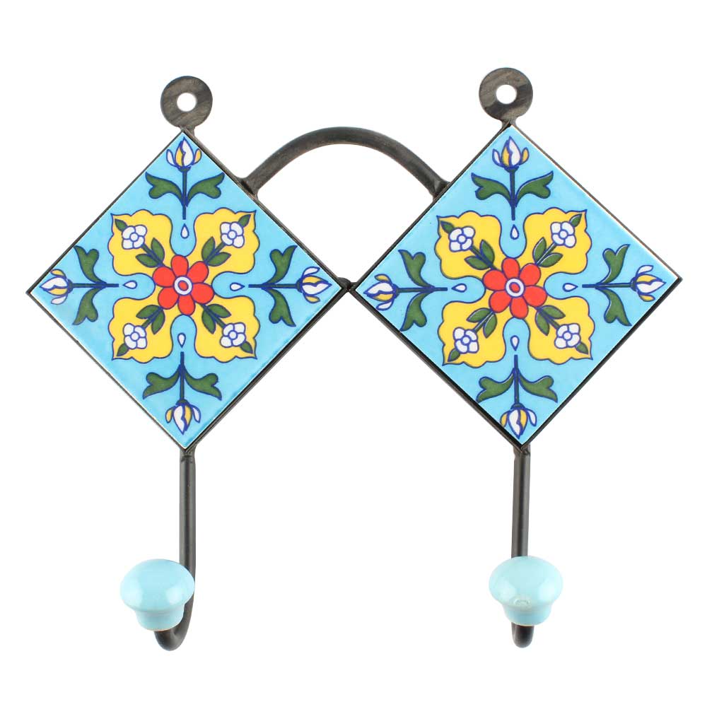Turquoise Base Red Tiny Flower Ceramic Tiles Hook. When Put on Wall or Cabinet It is An Art in Itself. The Metal Part of this Hook is Black Powder Coated.