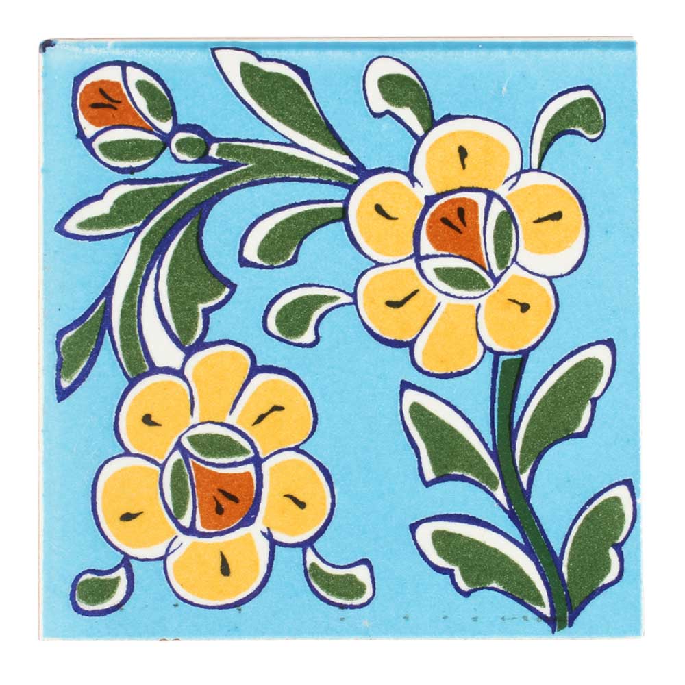 Turquoise Base Yellow Flower Ceramic Tiles. Good for Decorate Table Desks, Hung on the Walls, Install in Fireplaces, Bathrooms, Kitchens, Splash Guards etc.