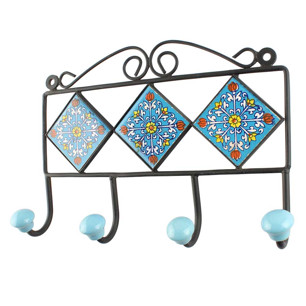 Turquoise Ceramic Floral Tiles Hook. When Put on Wall or Cabinet It is An Art in Itself. The Metal Part of this Hook is Black Powder Coated.