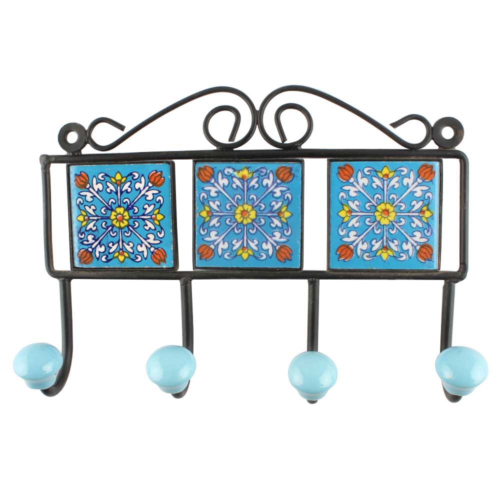 Turquoise Ceramic Floral Tiles Wall Hook. When Put on Wall or Cabinet It is An Art in Itself. The Metal Part of this Hook is Black Powder Coated.
