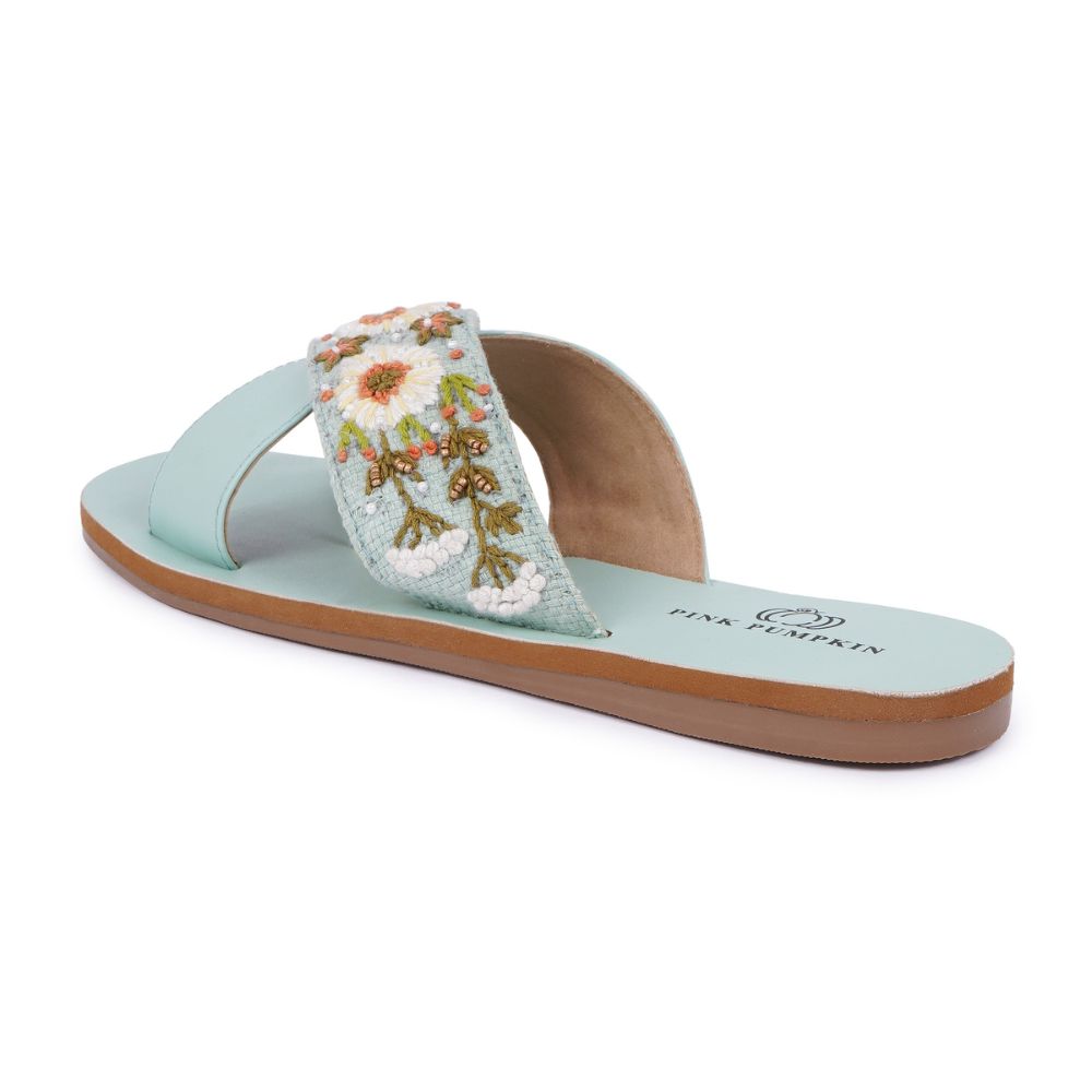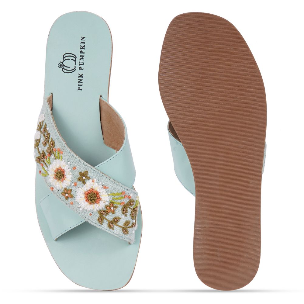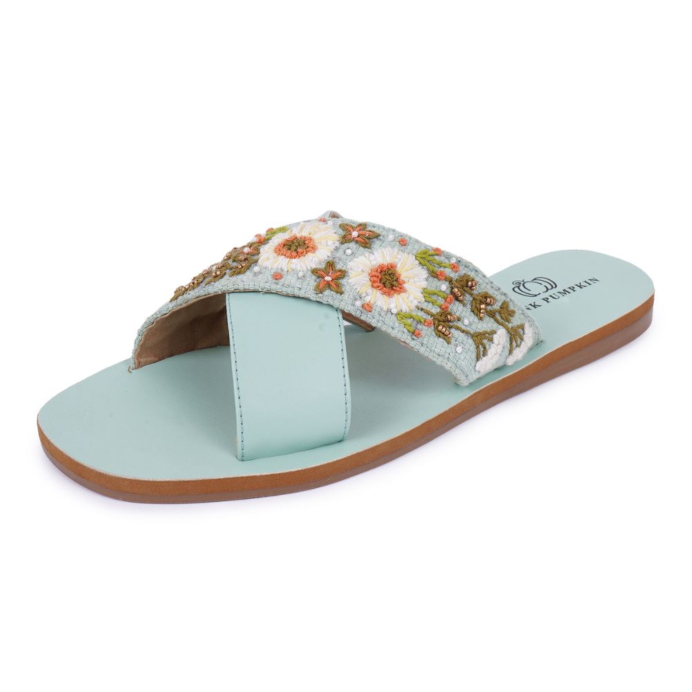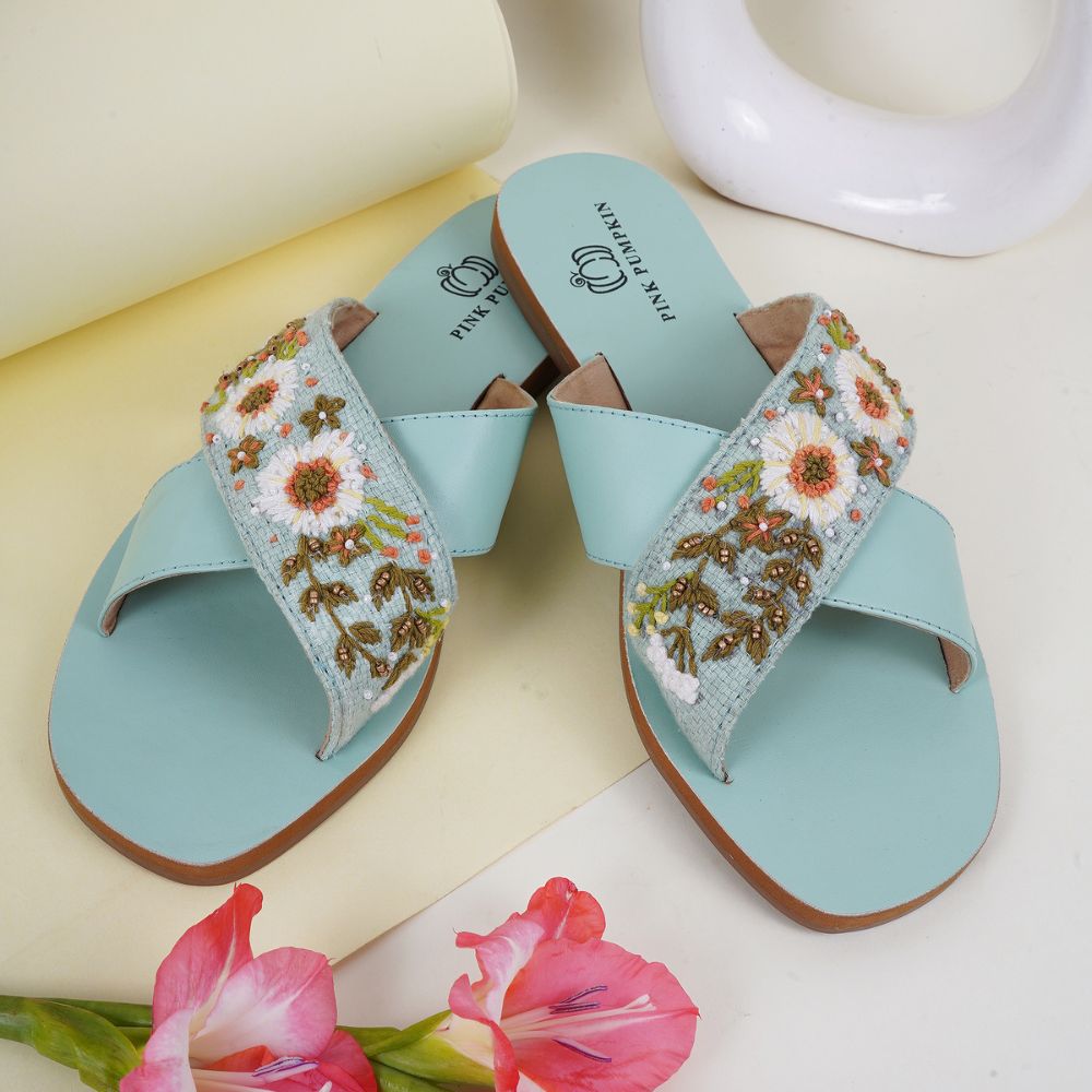 This cross over slipons unites cross over, daisies design with rexin, cotton fabric, textile, eva, tpr craftsmanship in a turquoise palette. Created for event planners, it enhances personal style or makes a memorable gift. Packed and quality checked by Indianshelf. Each piece is uniquely crafted by skilled artisans.