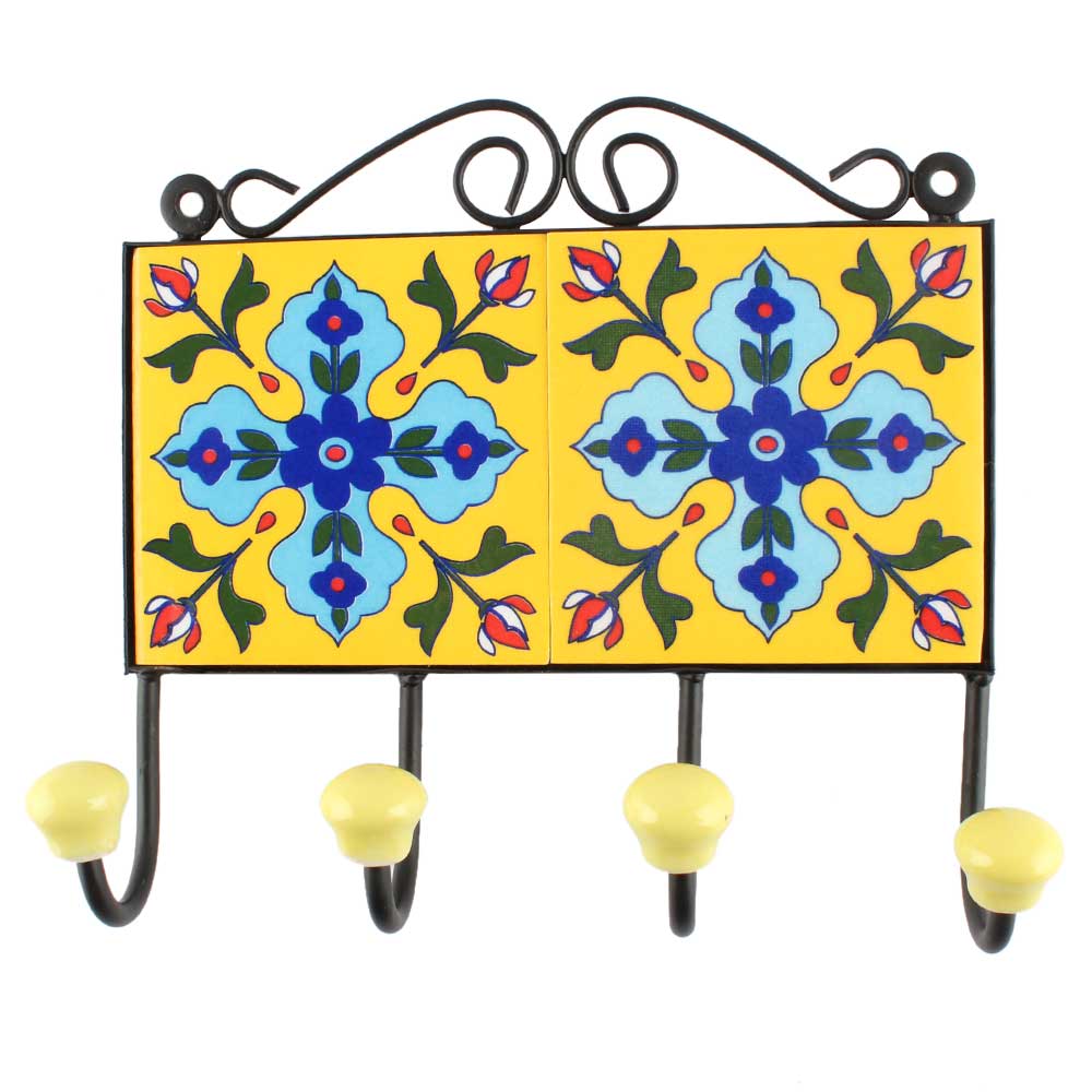 Turquoise Floral Ceramic Tile Hook. When Put on Wall or Cabinet It is An Art in Itself. The Metal Part of this Hook is Black Powder Coated.