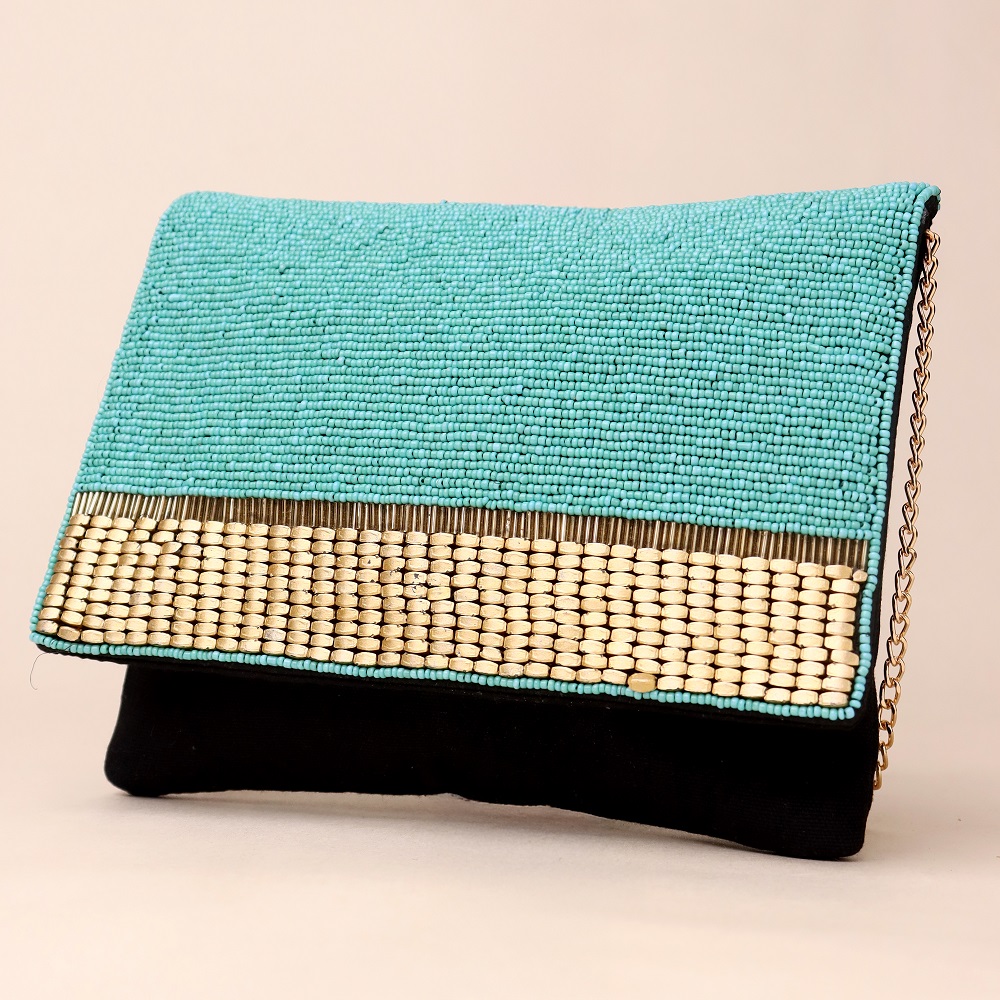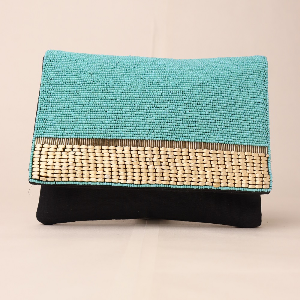 Elevate your accessory collection with this artisan-crafted clutch, designed with a vibrant turquoise beaded flap and a contrasting woven beige accent. The intricate beadwork showcases fine craftsmanship, while the sleek black base adds a sophisticated edge. Lightweight yet stylish, this clutch is perfect for evening outings, festive events, or as a statement piece for casual chic looks.
