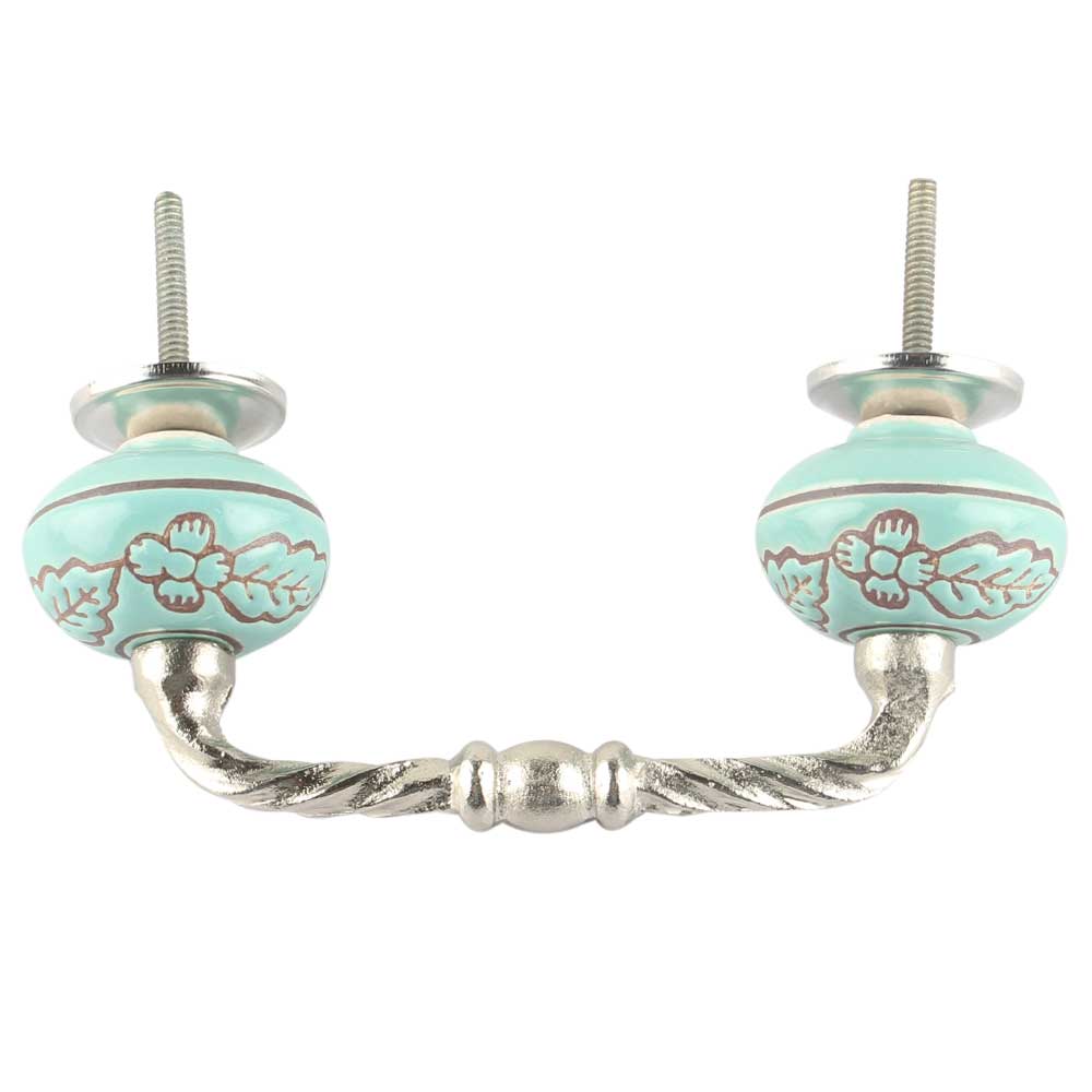 Turquoise Leaf Flower Etched Ceramic Cut Bridge Handle. Ideal for Drawer, Dresser, Cabinet, Wardrobe, Cupboard and Almirah etc.