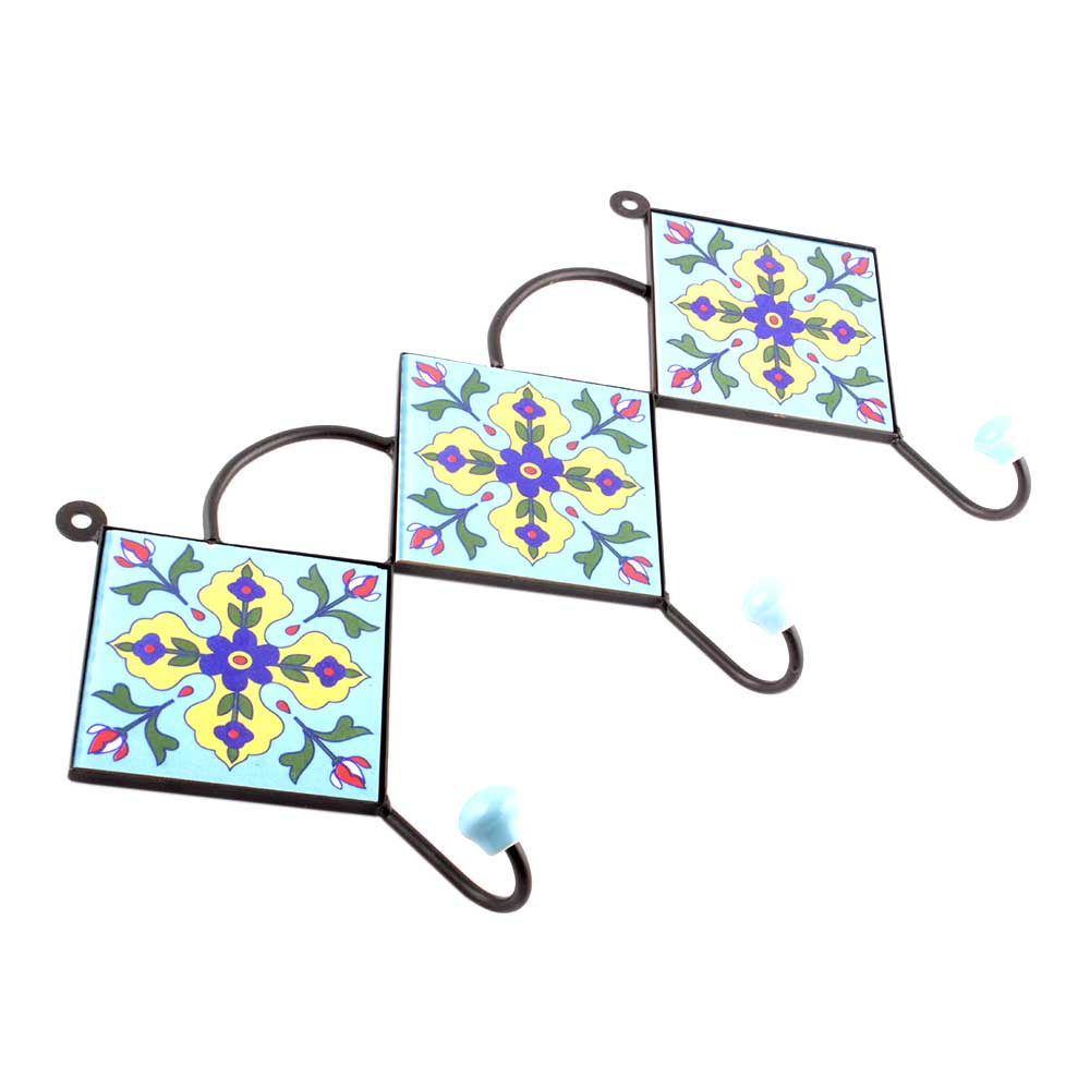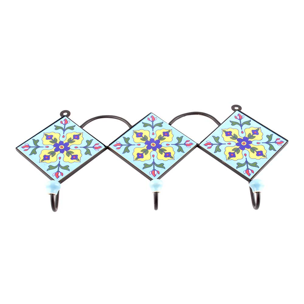 Turquoise Navy Blue Tiny Flower Ceramic Tiles Hooks. When Put on Wall or Cabinet it is an Art in itself. The Metal Part of this Hook is Black Powder Coated.