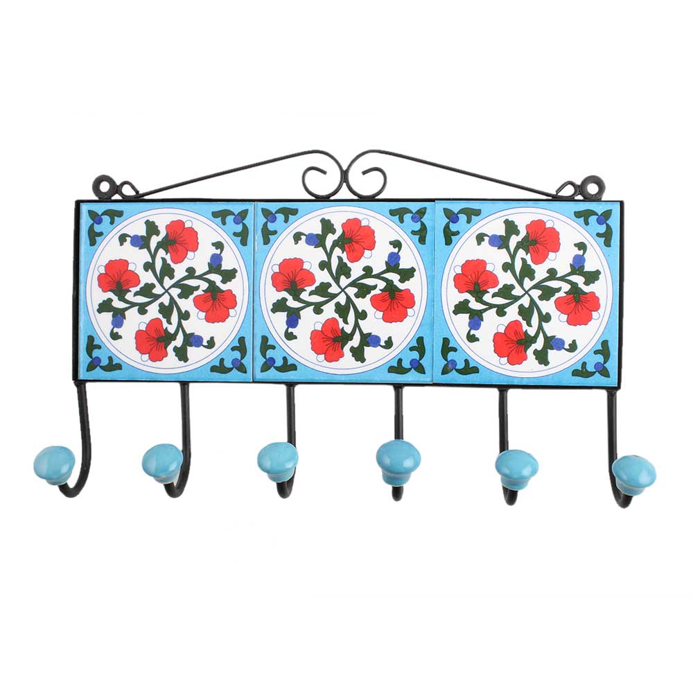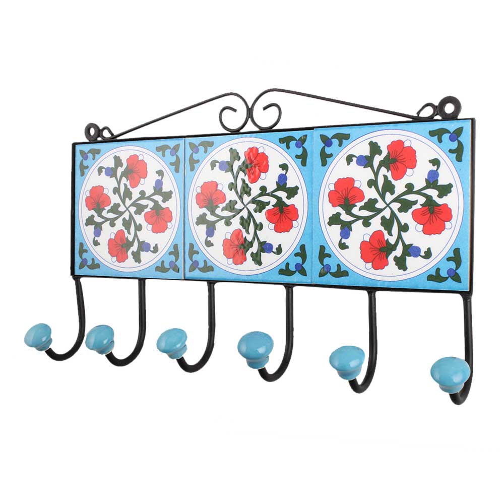 Turquoise Red Floral Tiles Hook. When put on wall or cabinet it is an art in itself. The metal part of this hook is black powder coated.