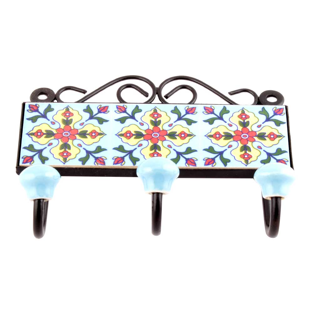 Turquoise Red Tiny Flower Tiles Hooks. When Put on Wall or Cabinet it is an Art in itself. The Metal Part of this Hook is Black Powder Coated.