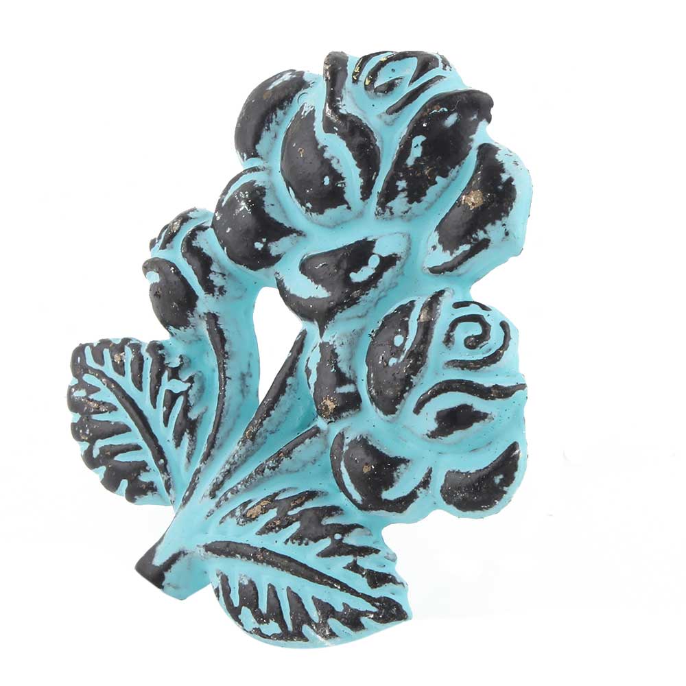 Turquoise Rose With Branch Distressed Iron Dresser Knob