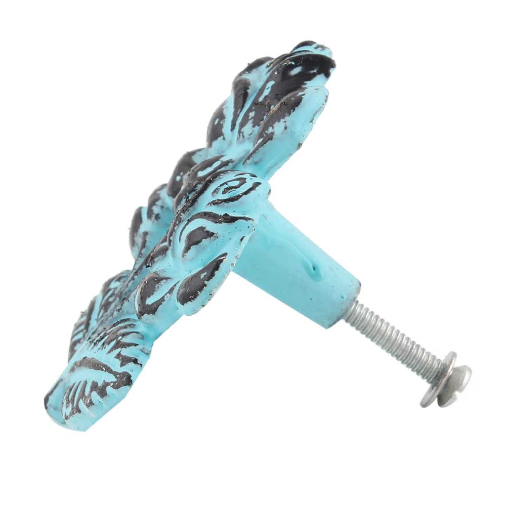 The Turquoise Rose with Branch Distressed Iron Dresser Knob features a vibrant turquoise-colored rose paired with delicate branch details. Its unique design adds a fresh, whimsical touch, making it an ideal accent for any piece of furniture in need of a colorful and elegant upgrade.