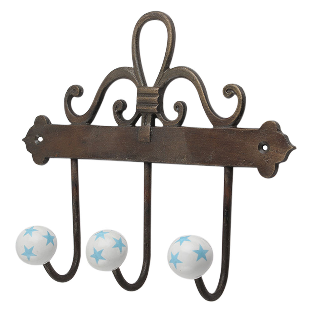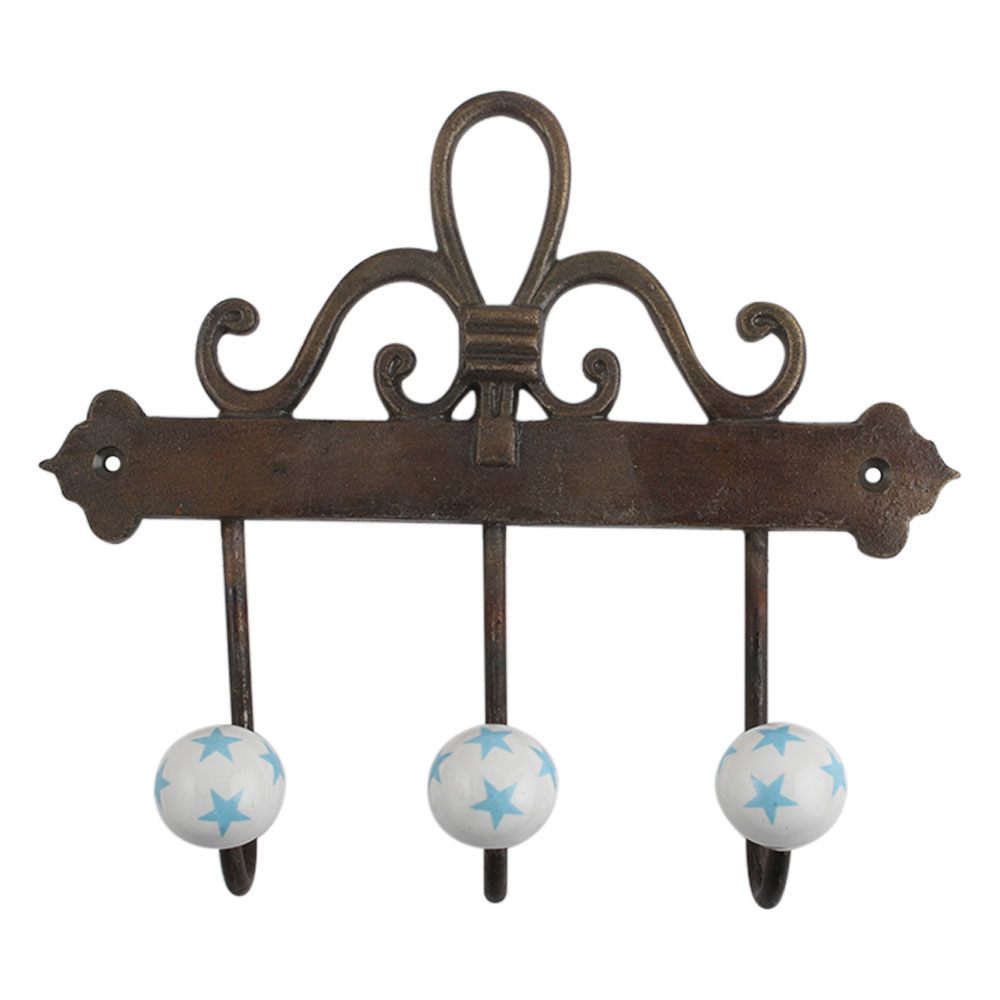 Turquoise Star Ceramic Iron Hook. A Perfect Complement to the Soft Tone of the Wood are these White Traditional Hat Coat Hook Made of Genuine Porcelain and Brass. It can be use to Hang Jewellery, Leashes, Towels, Scarves, Light Weight Sweaters, Caps Etc.