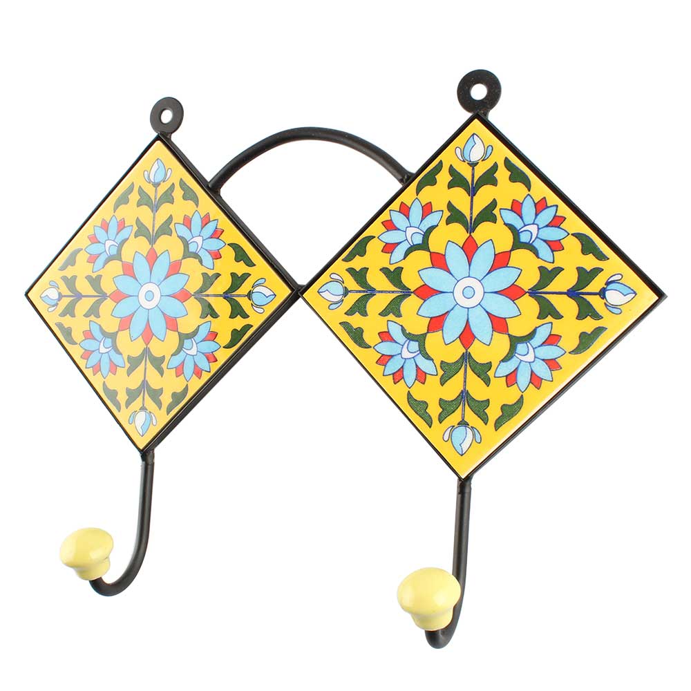 Material: Hand-glazed ceramic tile with a brushed metal hook Finish: Glossy turquoise ceramic with yellow sunflower detail; silver-toned hook Installation: Hidden screw mount with included hardware