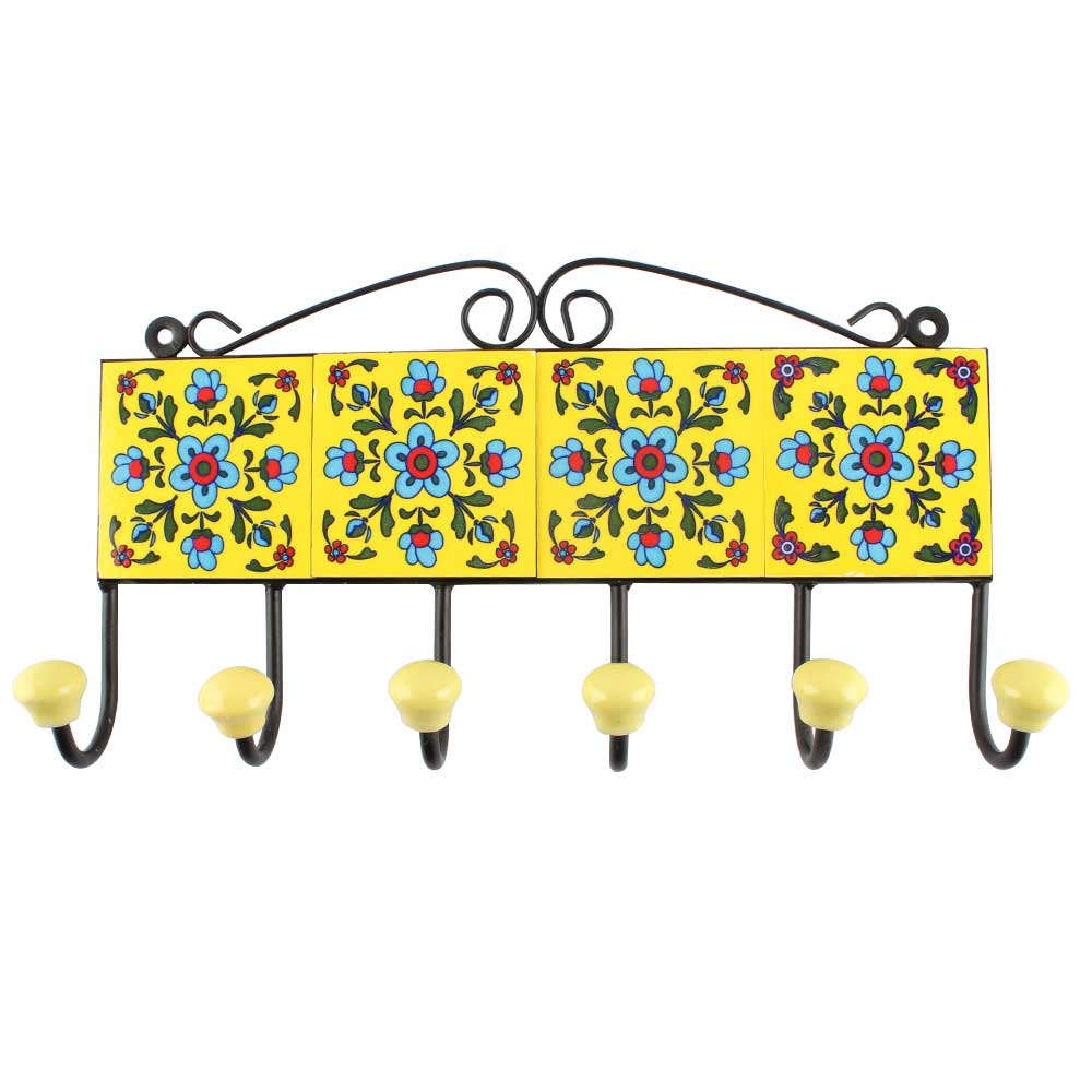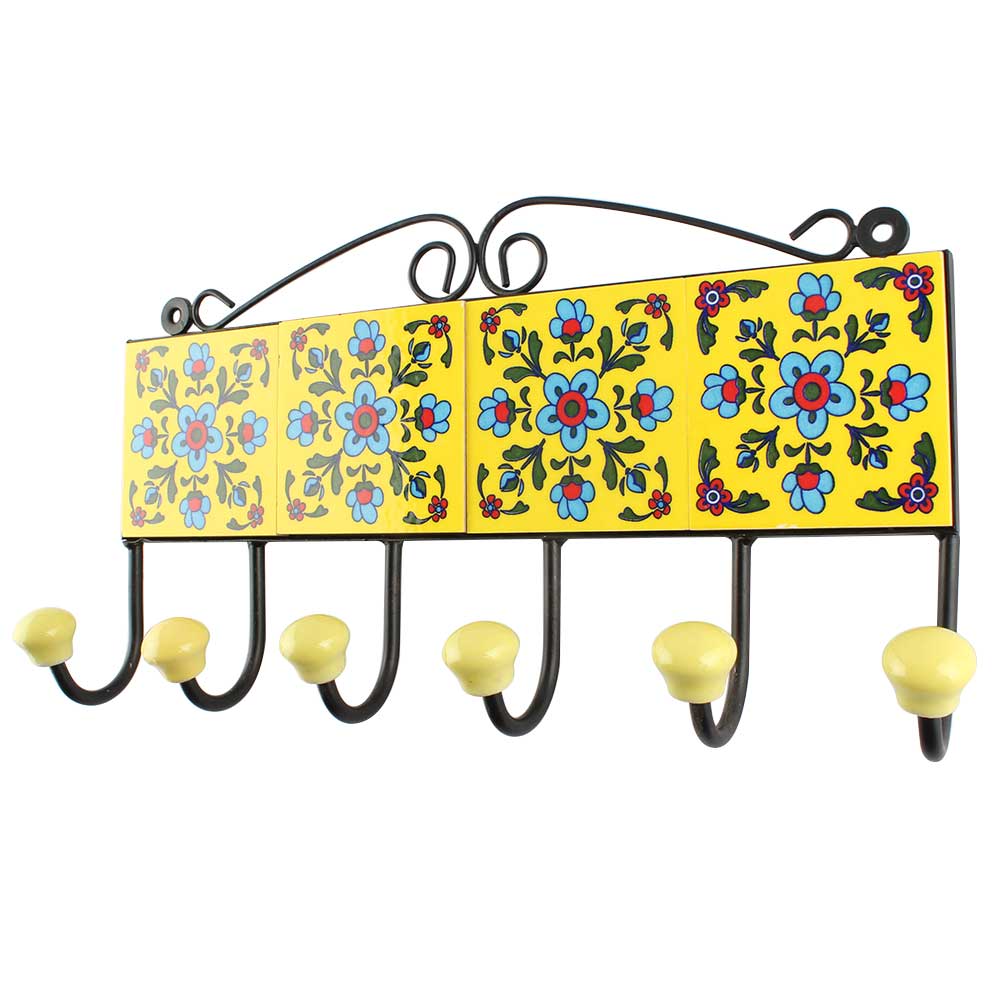 Turquoise Tiny Flower Ceramic Tile Hook. When Put on Wall or Cabinet It is An Art in Itself. The Metal Part of this Hook is Black Powder Coated.