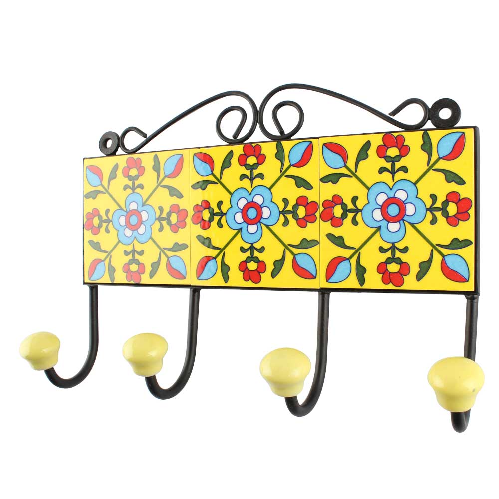 Turquoise Tiny Flower Ceramic Tile Hook Online. When Put on Wall or Cabinet It is An Art in Itself. The Metal Part of this Hook is Black Powder Coated.