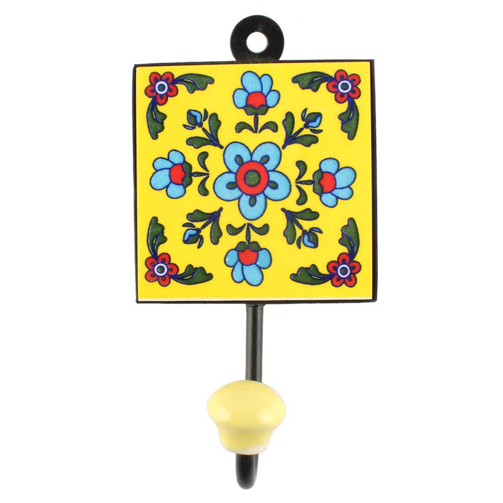 Turquoise Tiny Flower Ceramic Tile Wall Hook Online. When Put on Wall or Cabinet It is An Art in Itself. The Metal Part of this Hook is Black Powder Coated.