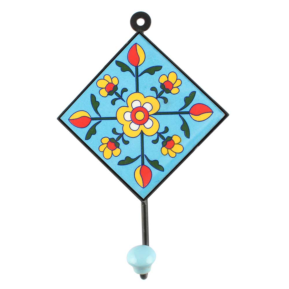 Turquoise Tiny Flower Ceramic Tiles Hook. When Put on Wall or Cabinet It is An Art in Itself. The Metal Part of this Hook is Black Powder Coated.