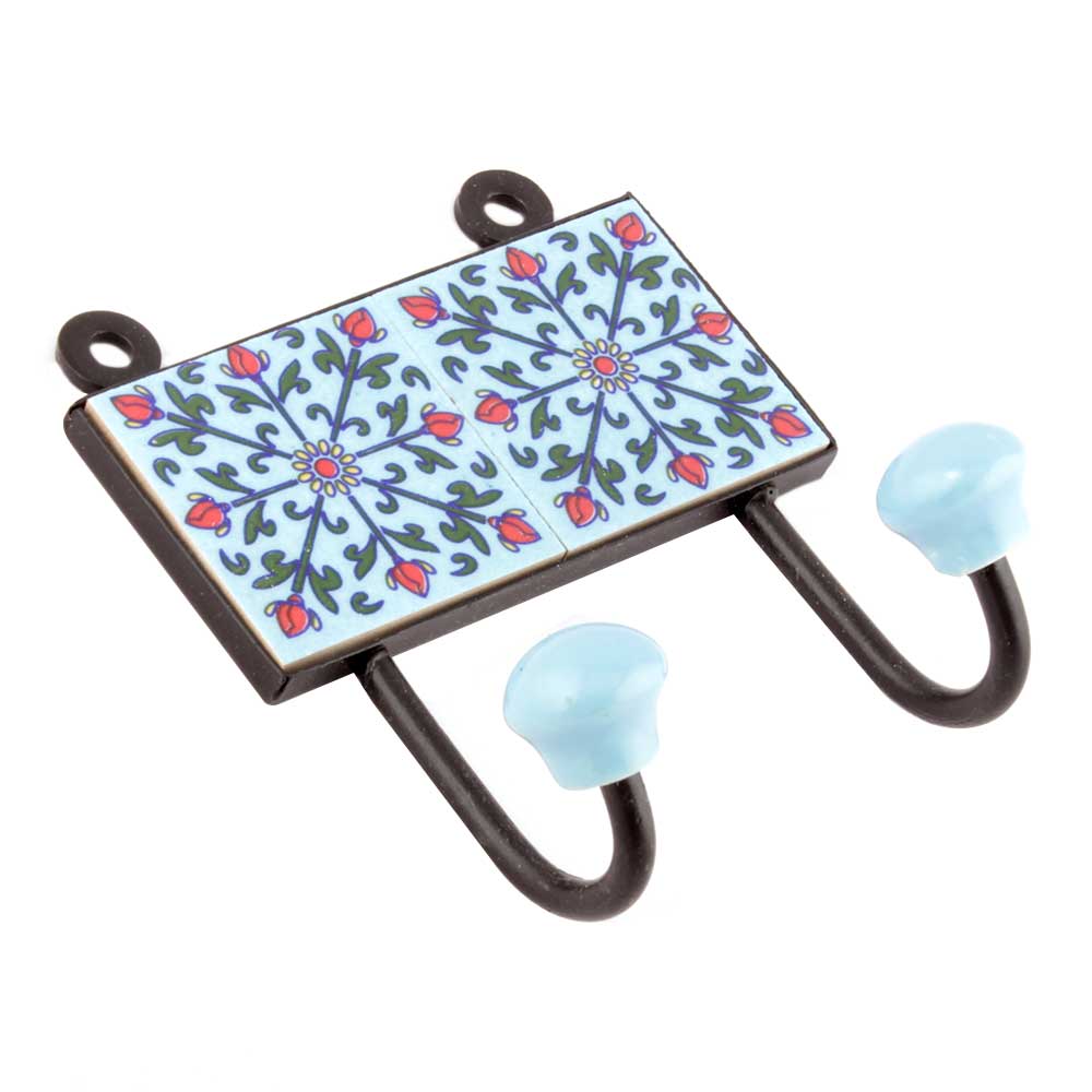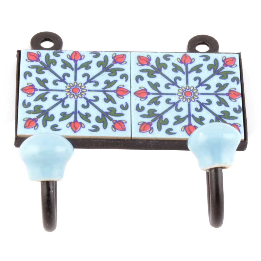 Turquoise Tiny Flower Tiles Hooks. When Put on Wall or Cabinet it is an Art in itself. The Metal Part of this Hook is Black Powder Coated.