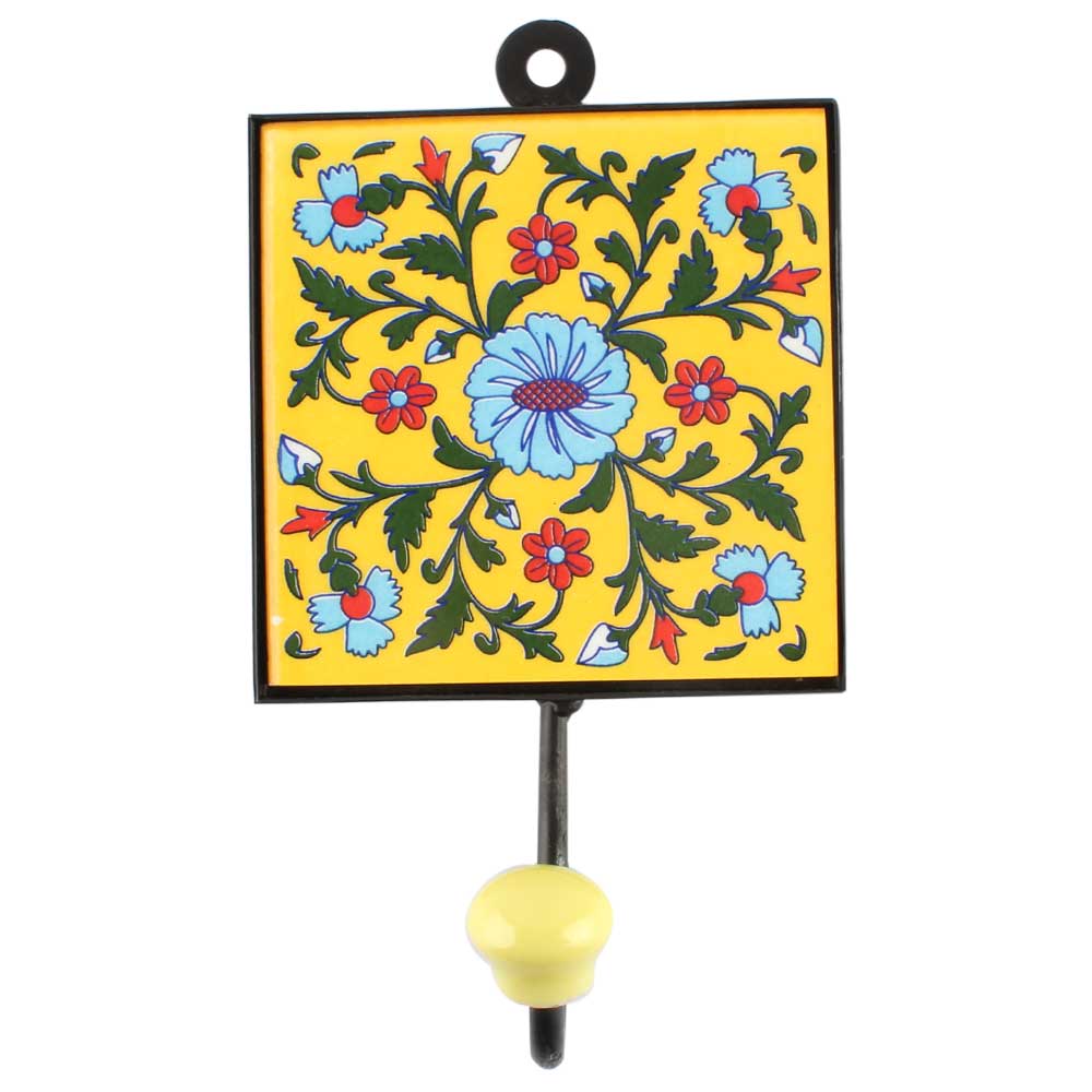 Turquoise Wheel Flower Ceramic Tile Hook Online. When Put on Wall or Cabinet It is An Art in Itself. The Metal Part of this Hook is Black Powder Coated.